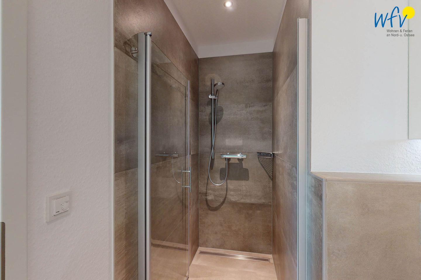 Das große, moderne Bad in elegantem Design verfügt über eine ebenerdige Dusche.