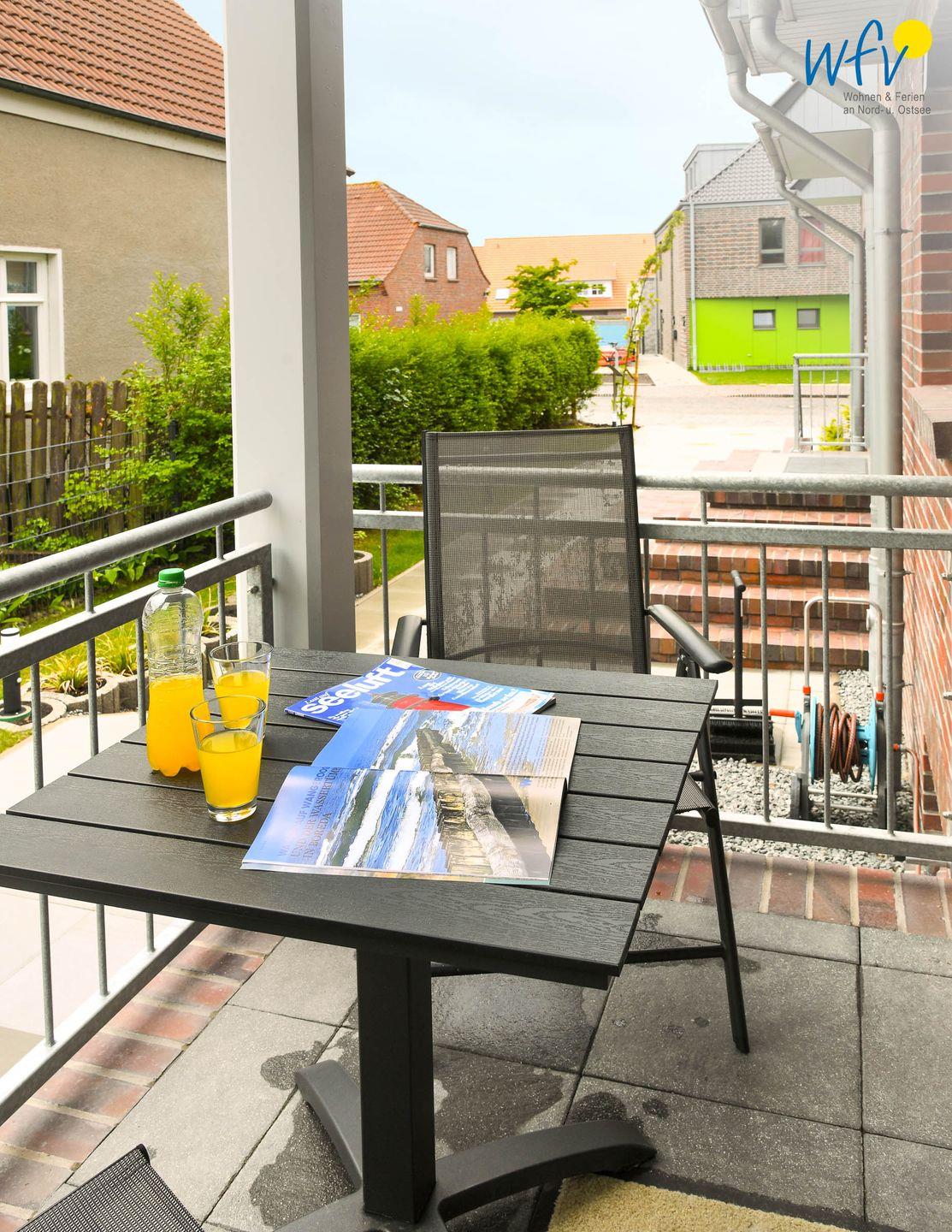 Wohltuende Nordseeluft genießen Sie auf dem hübsch möblierten, überdachten Balkon der Ferienwohnung. In Ruhe ein gutes Buch zu lesen oder den Tag bei einem guten Glas Wein ausklingen zu lassen ist ein wunderbares Urlaubsgefühl! Seitlich blicken Sie hier auf Wangerooges Naturschutzgebiet mit Wäldchen.
