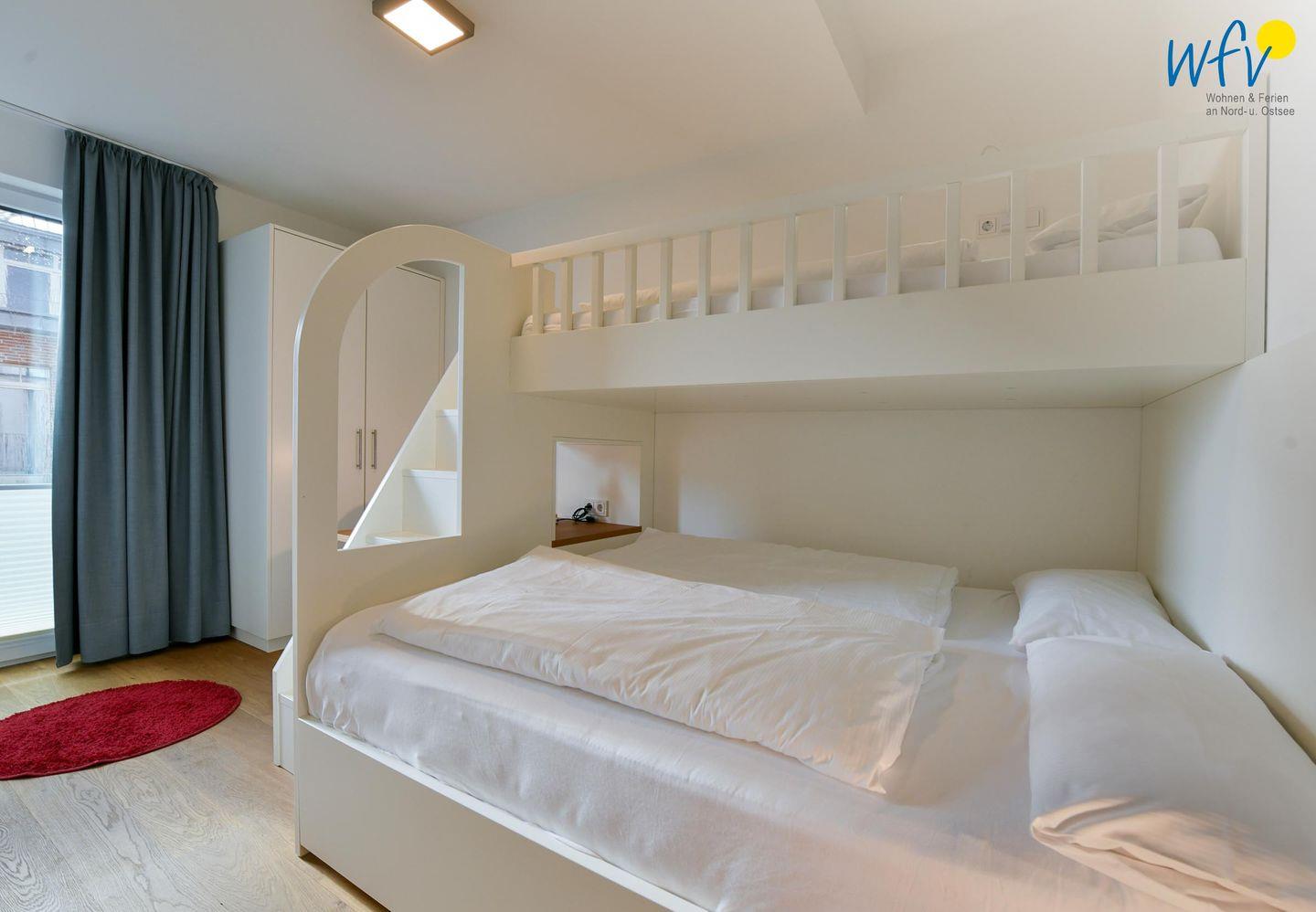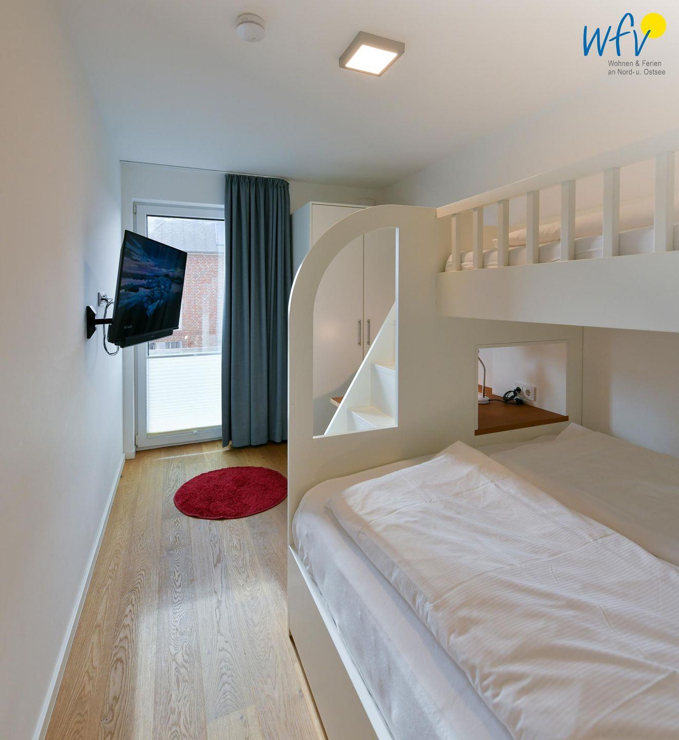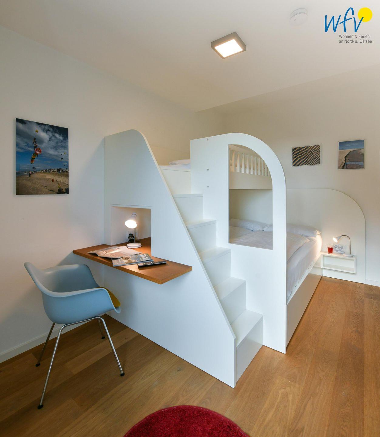Zwei großzügige separate Schlafzimmer bieten Ihnen angenehme Rückzugsmöglichkeiten. Eines der Zimmer ist mit einem hochwertigen Boxspringbett (180 x 200 cm) ausgestattet, das andere mit einem Doppelbett (160 x 200 cm) mit hochwertiger Matratze und Gelauflage. Darüber befindet sich in demselben Zimmer außerdem ein 90 cm breites Hochbett sowie ein kleiner Schreibtisch und ein maßangefertigter Kleiderschrank. In beiden Zimmern steht Ihnen ein moderner Fernseher zur Verfügung.