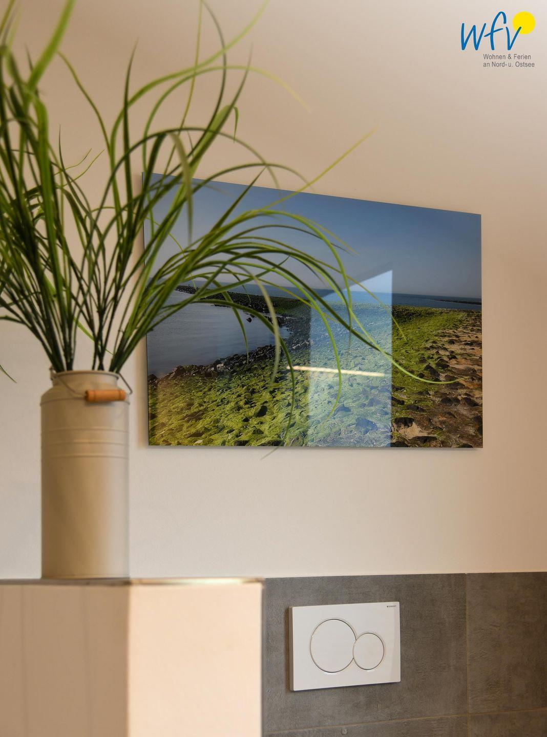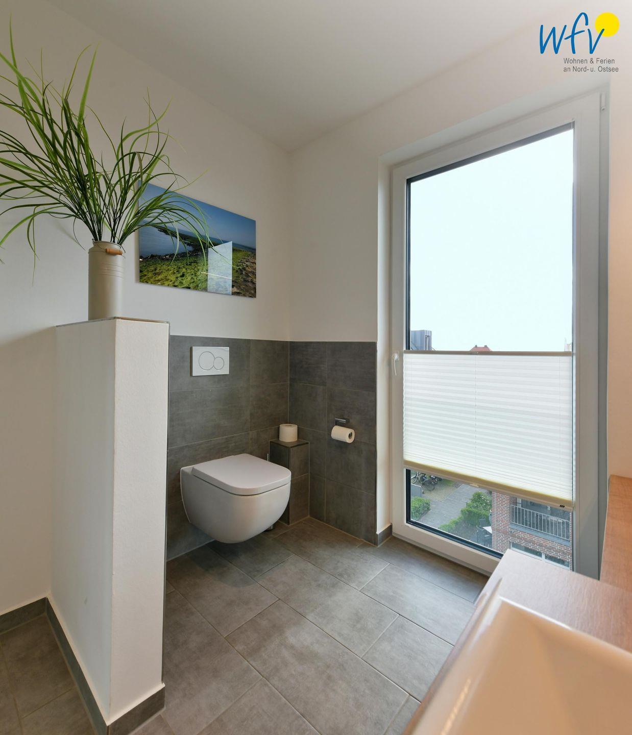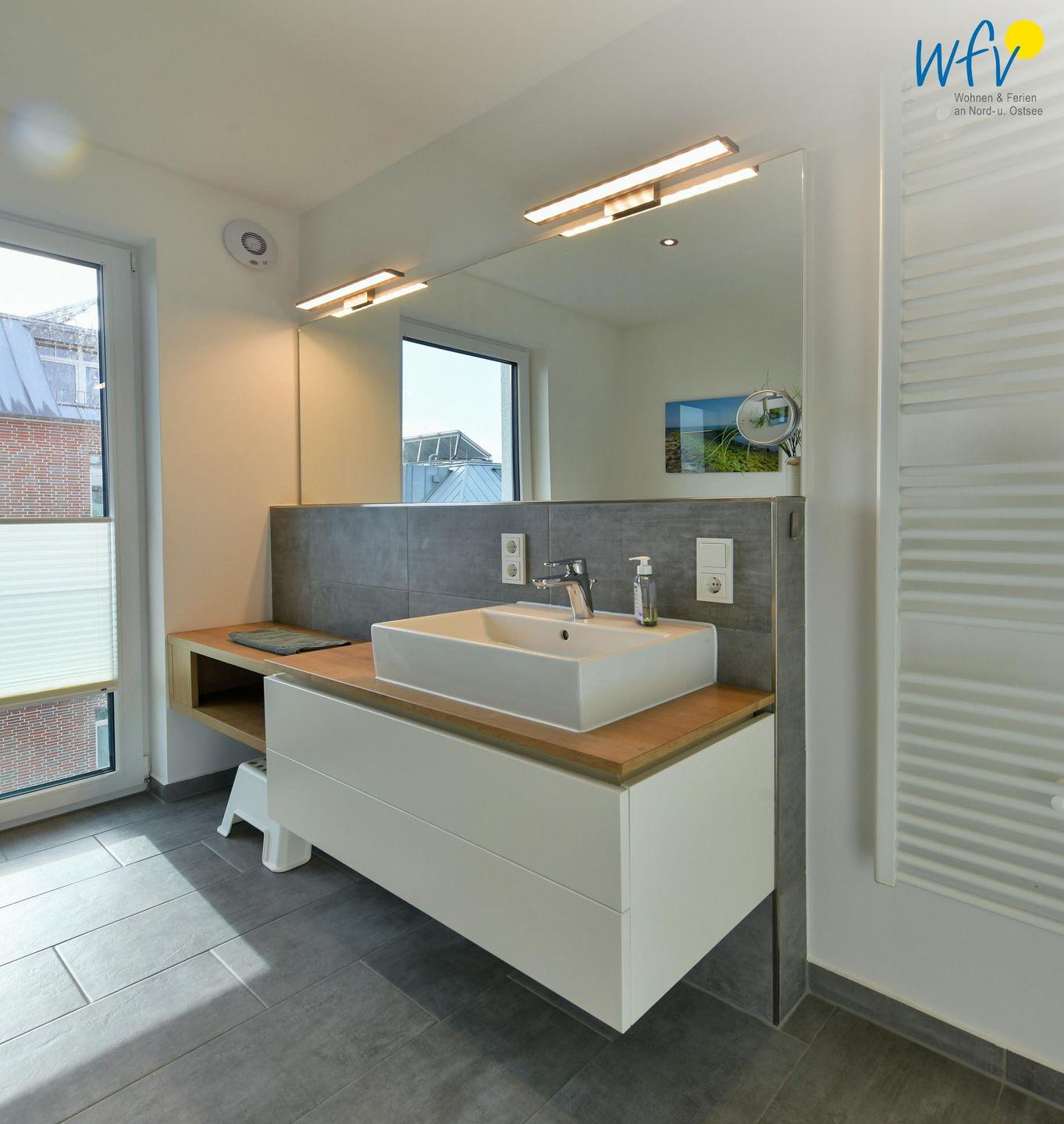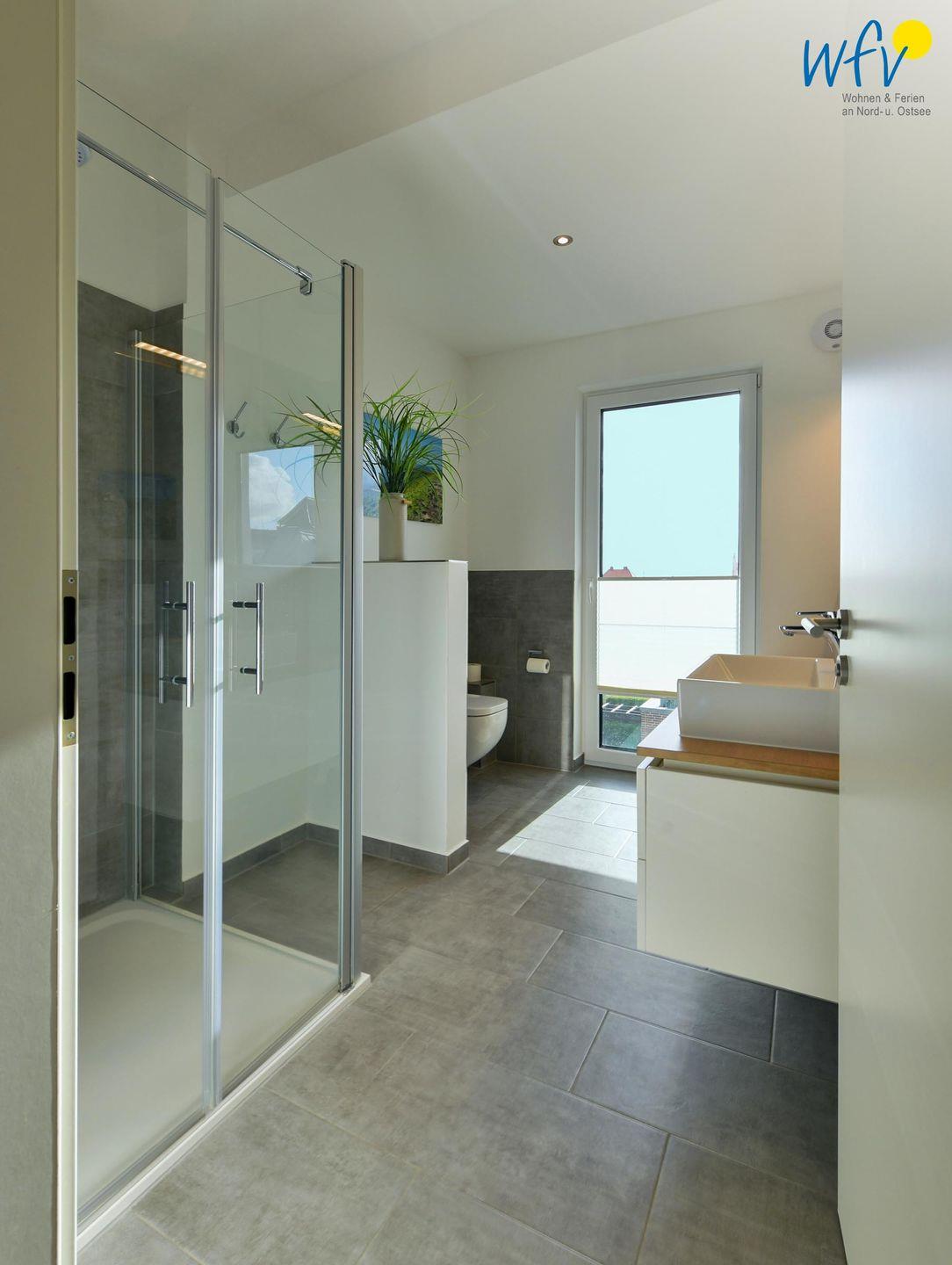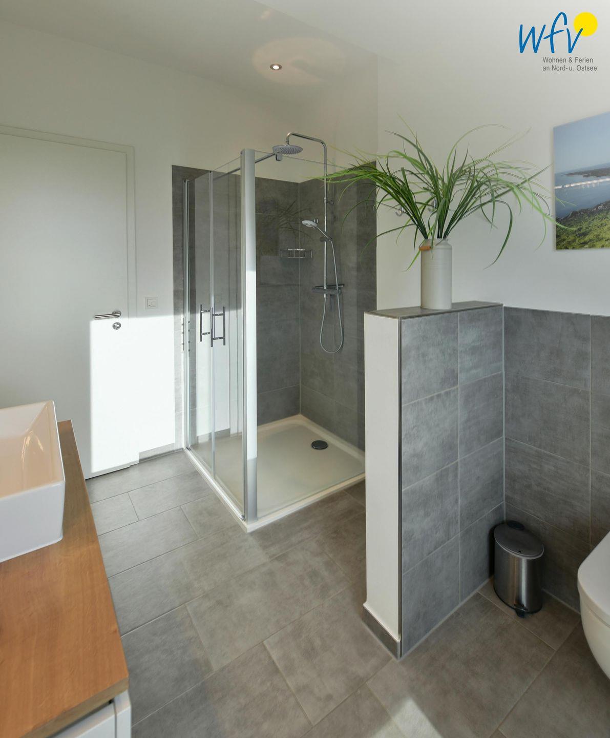 Das große, moderne Bad in elegantem Design ist u.a. mit einer ebenerdigen Dusche mit Regenduschkopf ausgestattet. Selbst von hier aus können Sie auf die glitzernden Wellen der Nordsee blicken!