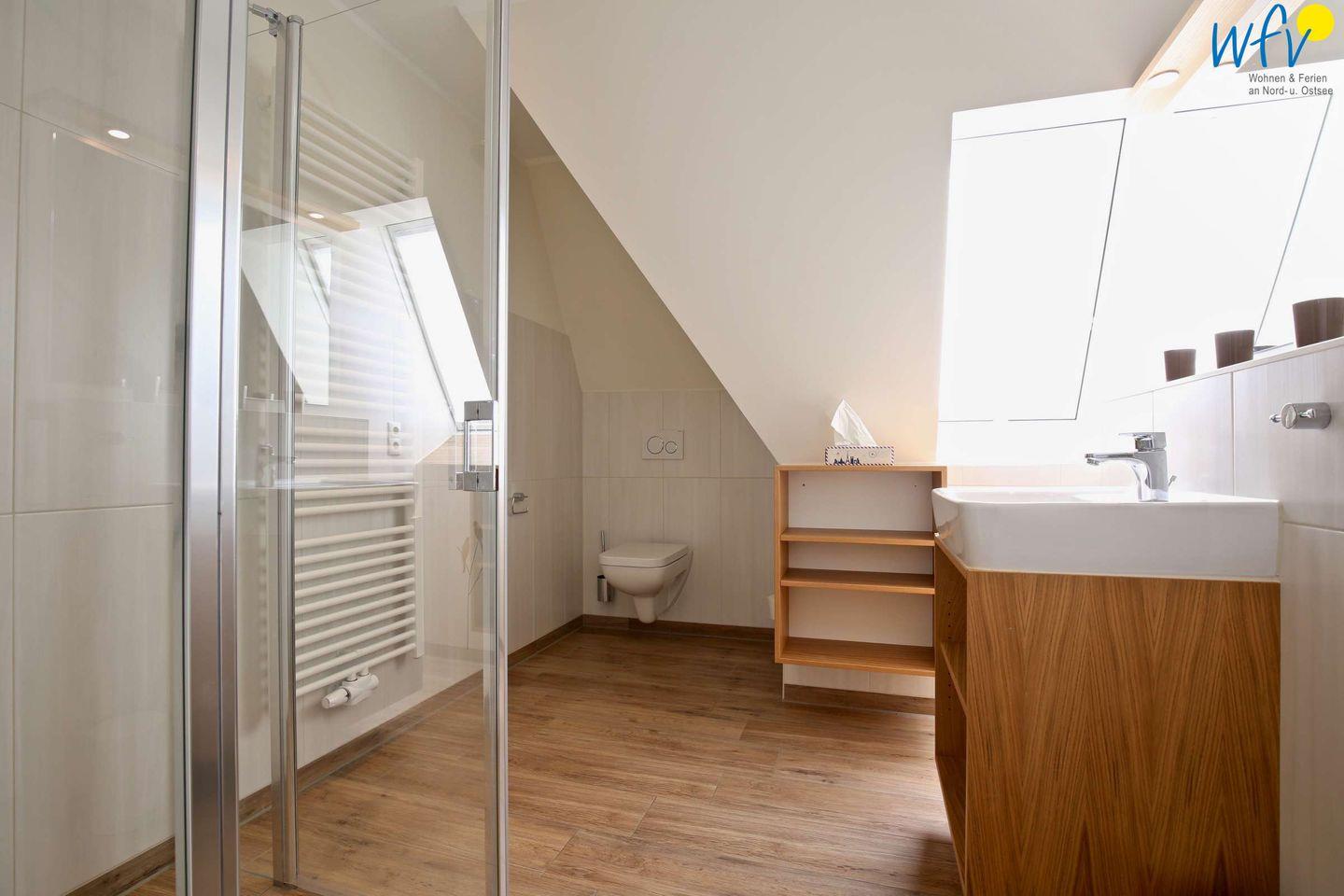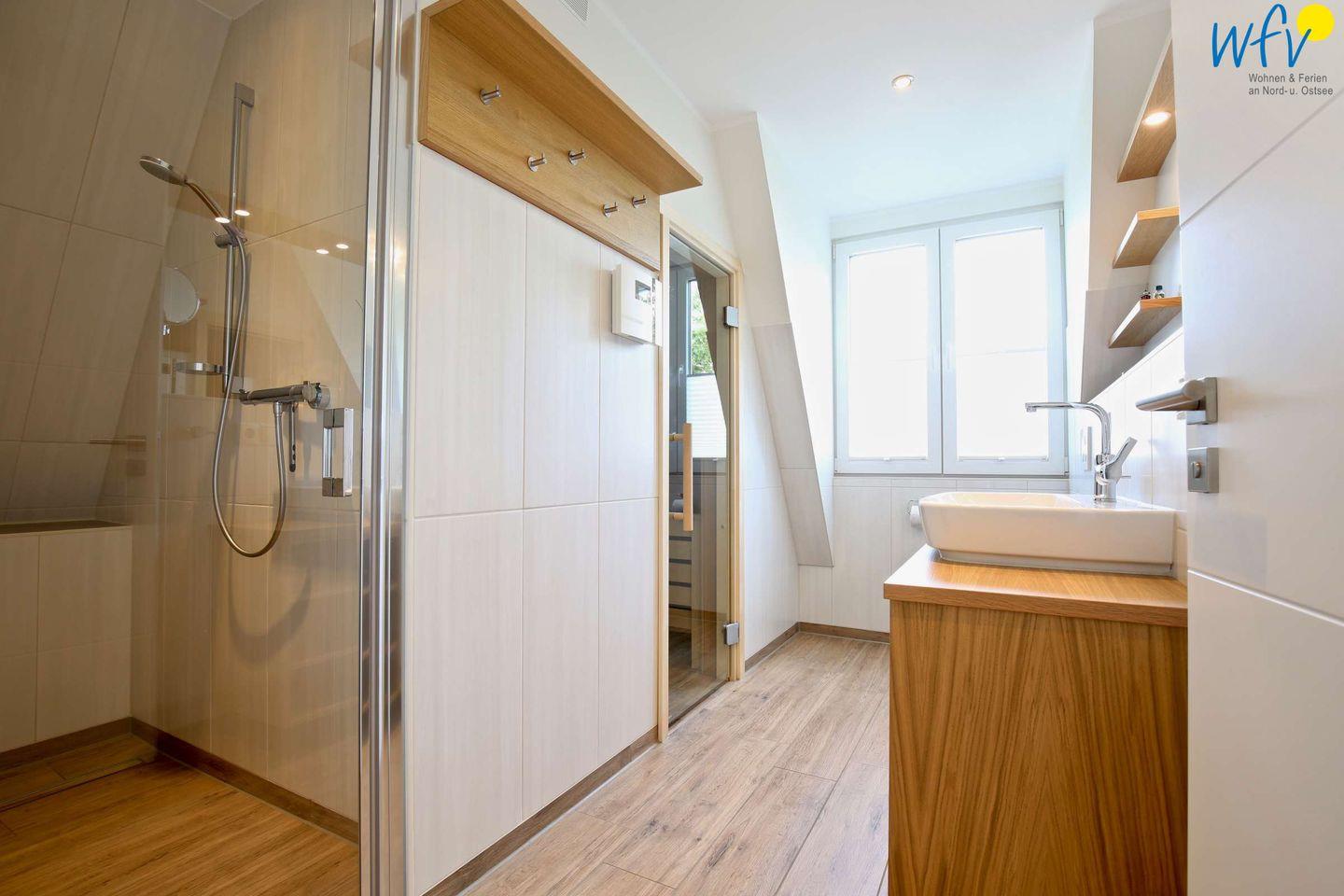 Zwei vollausgestattete Tageslichtbäder überzeugen mit elegantem Design; zudem sorgt eine wohnungseigene Sauna für weitere Exklusivität in Ihrem Urlaub. Perfekt für die wohltuende Entspannung nach dem Strandspaziergang!