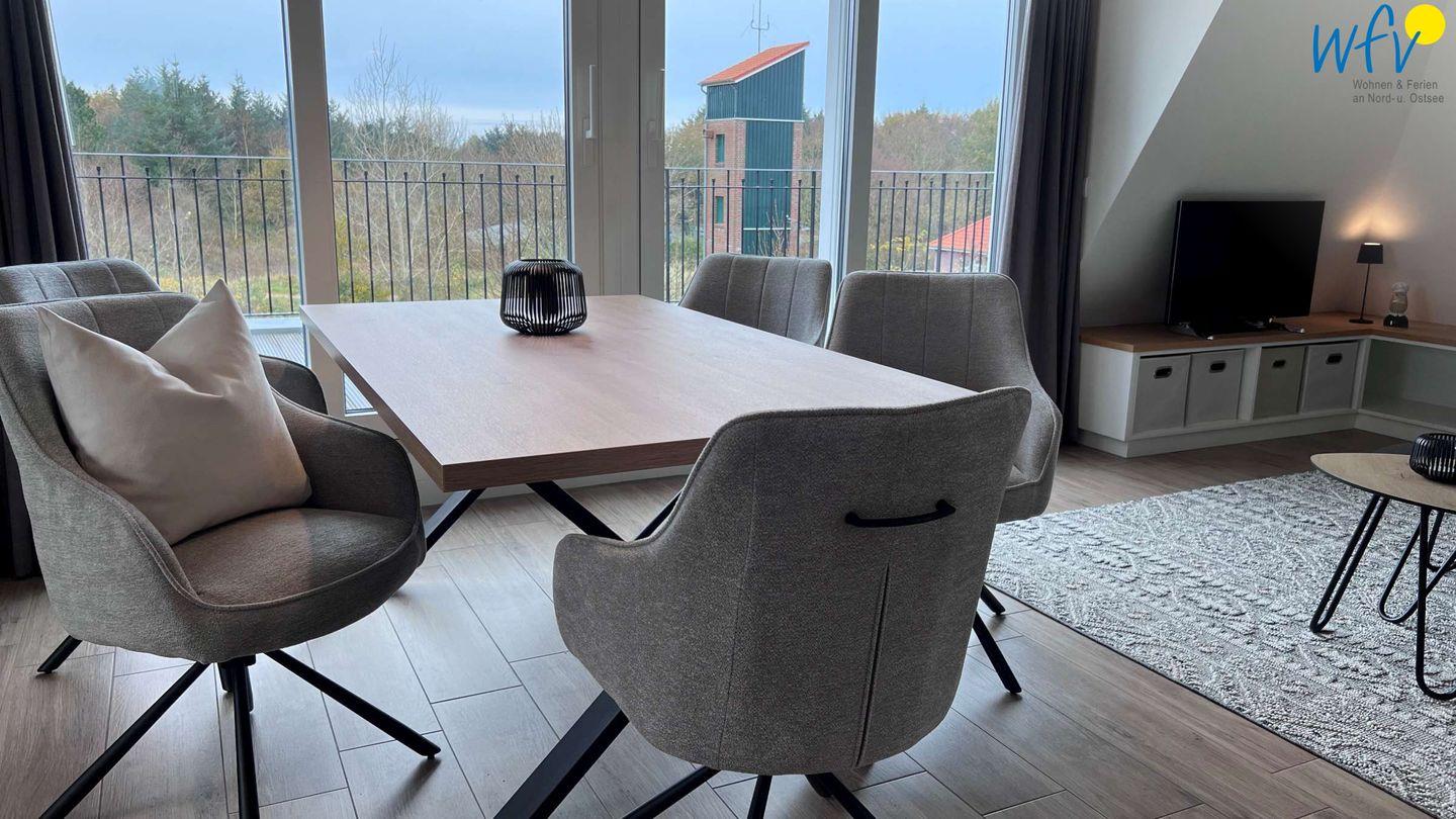 Der helle Lichteinfall, stilvolle Möbel in harmonischer Farbgebung und maritime Accessoires sorgen für schönes Flair und das entsprechende Nordseegefühl. Eine Fußbodenheizung bietet zusätzlichen Wohnkomfort und wohlige Wärme. Der Essplatz mit schönem Blick ins Grüne lädt zum ausgiebigen Ferienfrühstück ein, die Couchecke mit modernem TV und HiFi-Anlage zu gemütlichen Stunden zum Entspannen und die komfortablen Betten in den separaten Schlafzimmern zum langen Ausschlafen.