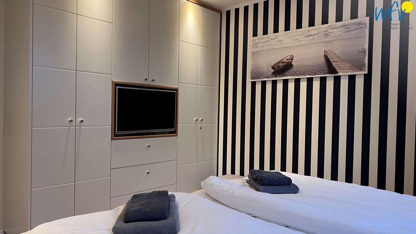Durch zwei separate Schlafzimmer mit komfortablen Doppelbetten bestehen angenehme Rückzugsmöglichkeiten. In einem der Zimmer befindet sich ein Einzelbett für eine weitere Person. Vom Bett aus können Sie gemütlich fernsehen. Die geräumigen Kleiderschränken bieten viel Platz für Ihre Urlaubsgarderobe.