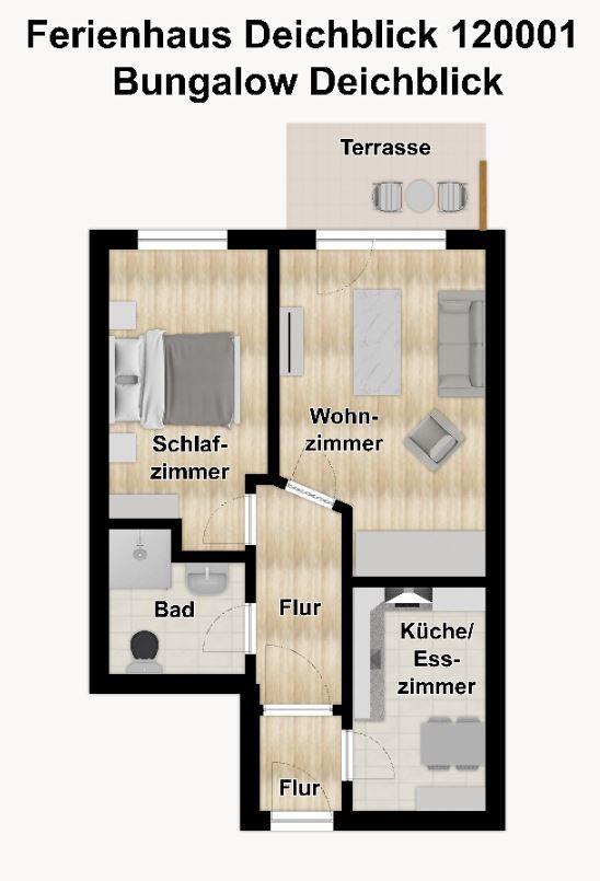 Der Bungalow "Deichblick" besticht durch seine absolut ruhige Lage. Hier können Sie wunderbar die Seele baumeln lassen und entspannen. Besonders die 21 m² große Terrasse mit Markise, Gartenmöbeln, Liegen und Holzkohlegrill lädt zum Relaxen und gemütlichem Beisammensein ein. Die Terrasse liegt zur Wattseite.