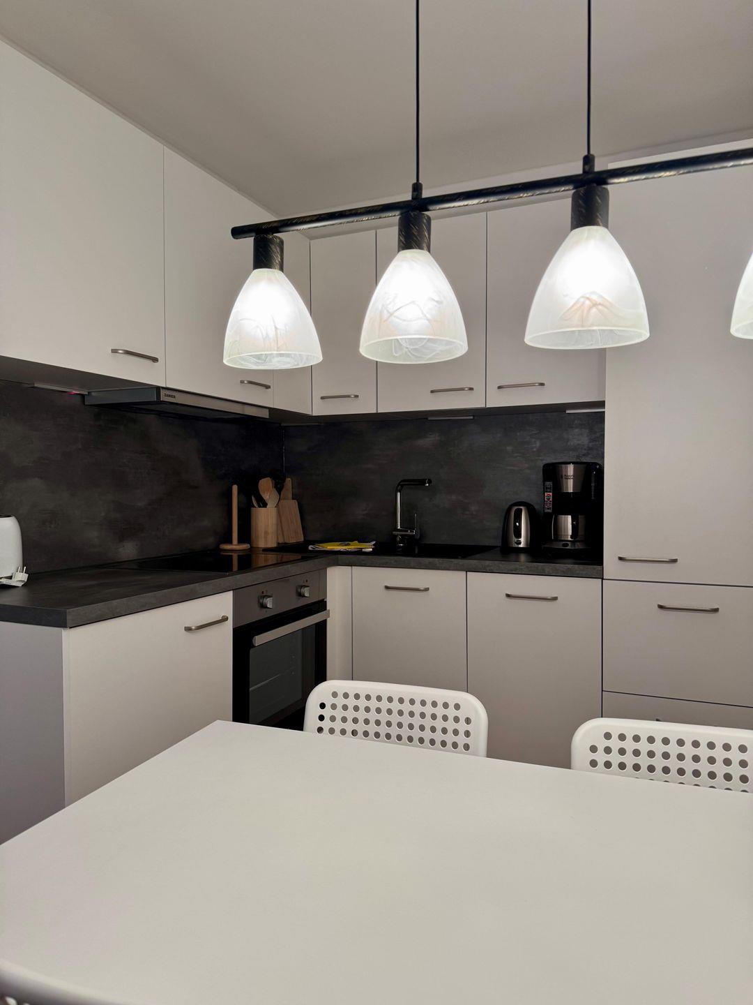 Für eine angenehme Selbstverpflegung ist die Küche modern und komplett ausgestattet. U.a. mit Ceran-Kochfeld, Kühlschrank mit Gefrierfach und Geschirrspüler. Zusätzlich gibt es einen Esstisch für vier Personen.