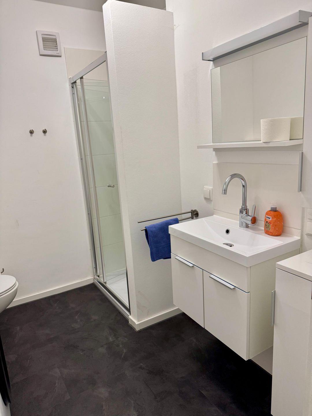 Das gepflegte Duschbad in modernem Design rundet den Wohnkomfort ab. Hier befindet sich eine eigene Waschmaschinen für Ihre Wäsche.