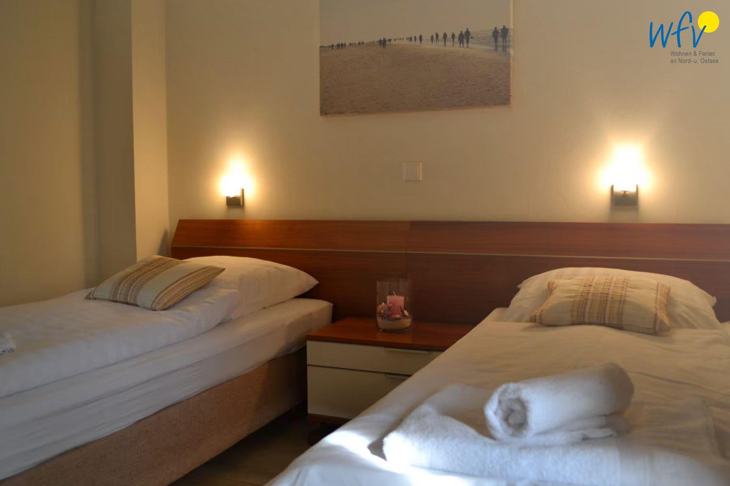 Auch in den zwei separaten Schlafzimmern empfängt Sie hoher Wohnkomfort. Eines der Zimmer ist mit einem Doppelbett ausgestattet (2 x 90 x 200 cm), das andere mit zwei Einzelbetten (je 90 x 200 cm). In beiden Zimmern befindet sich ein modernes TV.