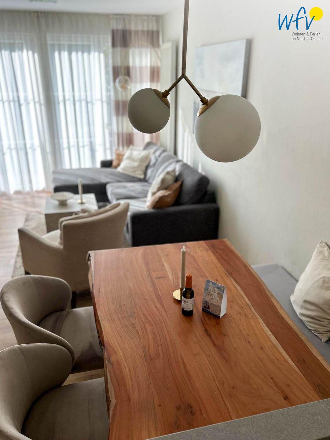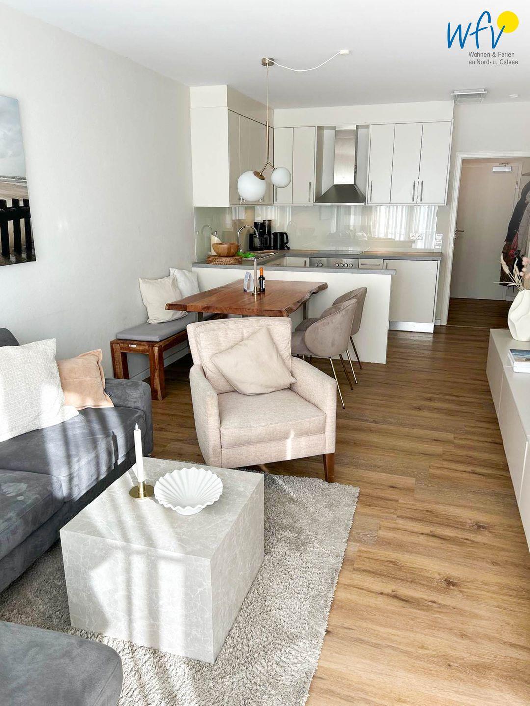 Die Wohnung überzeugt durch ihre offene und lichtdurchflutete Gestaltung, die eine einladende Atmosphäre schafft. Der gemütliche Wohnbereich ist mit einem Sofa und einem Essbereich ausgestattet, der Platz für gemeinsame Mahlzeiten bietet. Die hochwertige Einrichtung umfasst einen modernen Fernseher sowie freies WLAN, sodass Sie auch im Urlaub online bleiben können. Die moderne Küche ist voll ausgestattet und lässt keine Wünsche offen: vom Herd über die Mikrowelle bis hin zur Spülmaschine – hier kann jeder Hobbykoch seine kulinarischen Fähigkeiten entfalten.