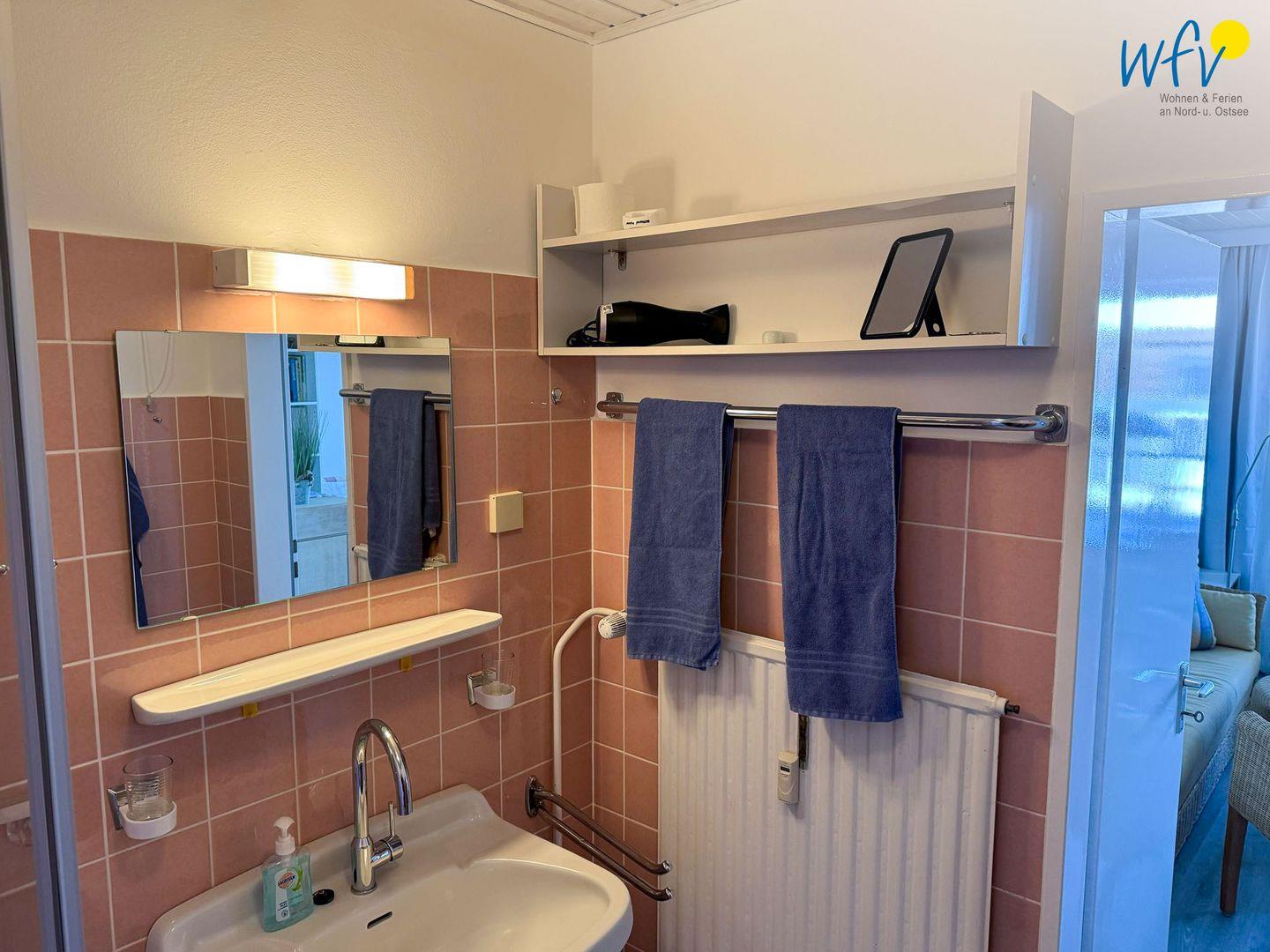 Das gepflegte Badezimmer ist mit Dusche, WC und Haartrockner ausgestattet.