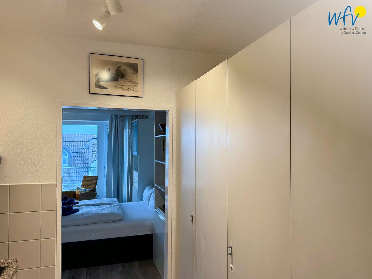 Ein gemütlicher Wohn-/Schlafraum mit Sofa, Sesseln und TV sowie einem bequemen Doppelbett (140 x 200 cm) lädt zum Verweilen ein. Hier können Sie die Abende bei einem Film genießen oder eine spannende Urlaubslektüre lesen. Der Esstisch am Fenster bietet ausreichend Platz für gemeinsame Mahlzeiten. Aus dem Wohn- und Schlafbereich haben Sie einen sehr schönen Meerblick auf die Wellen der Nordsee.