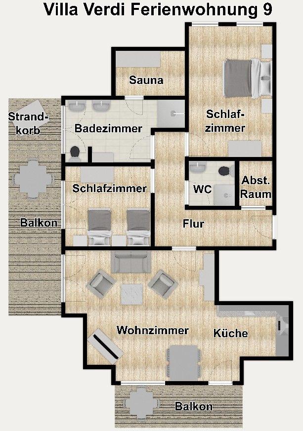 Willkommen in der Ferienwohnung 9 der Villa Verdi auf Wangerooge! Genießen Sie eine hochwertige Ausstattung mit kompletter Küchenzeile, drei TVs, WLAN, zwei separaten Schlafzimmern, eigener Sauna, Süd-West Balkon mit Blick nach Westen, teilw. Meerblick und Strandkorb sowie Südbalkon mit Blick auf den alten Leuchtturm. Die stilvolle Penthousewohnung bietet mit 98 m² auf der 3. Etage (Aufzug) Platz für bis zu 4 Personen. In dieser wunderbaren Unterkunft erleben Sie unvergessliche Urlaubsmomente!