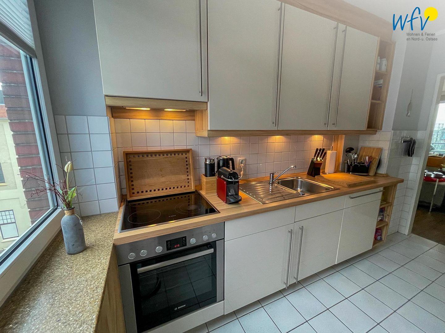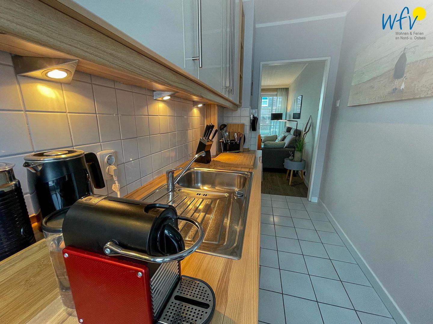 Für die bequeme Selbstverpflegung verfügt die offene Küche u.a. über einen 4-Platten-Herd, eine Spülmaschine und einen Backofen. Kaffee-Gourmets brühen sich eine Kaffeeauswahl in der Nespresso-Maschine auf (Kapseln). Ob für ein romantisches Dinner oder ein entspanntes Frühstück – hier haben Sie alle Möglichkeiten, sich kulinarisch zu verwöhnen. Ein schöner Essplatz am Fenster lädt zu gemeinsamen Mahlzeiten mit Blick in die Umgebung ein.