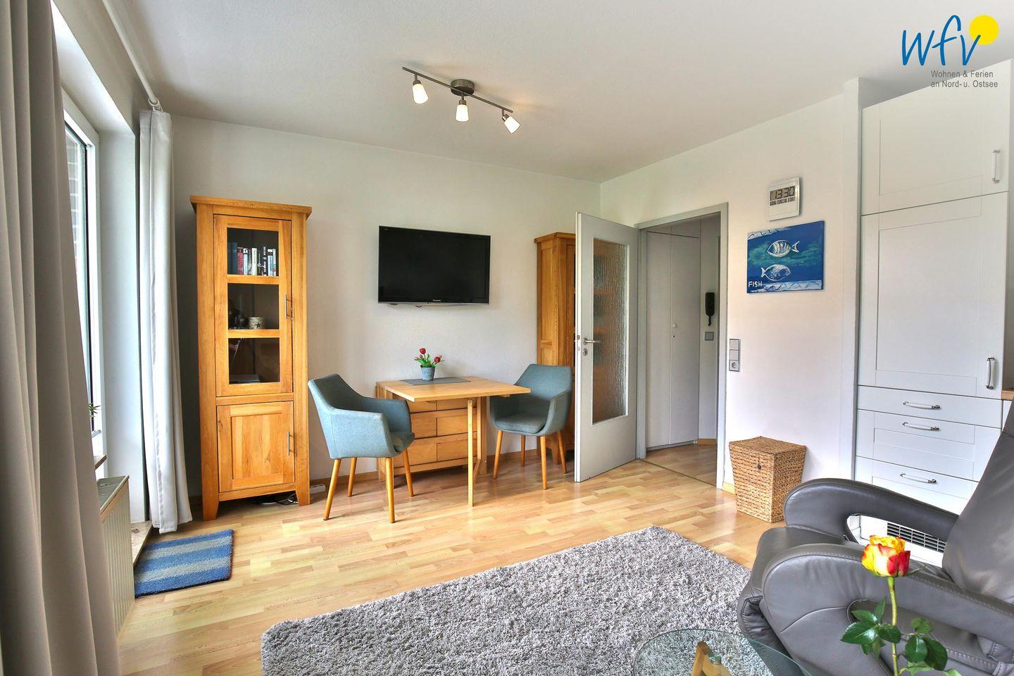 Zum Wohlfühlen lädt auch der gemütliche Wohnraum mit Couch und Relaxsessel sowie TV, DVD-Player und Radio ein. In der integrierten voll ausgestatteten Küchenzeile - u.a. mit Ceranherd, Backofen und Spülmaschine - lassen sich schnell und einfach leckere Mahlzeiten zubereiten. Diese können Sie in Ruhe im Essbereich mit ausziehbarem Esstisch einnehmen. Oder Sie dinieren bei wohltuender Nordseeluft: auf dem Balkon laden bequeme Gartenmöbel mit Auflage zum Verweilen ein.
