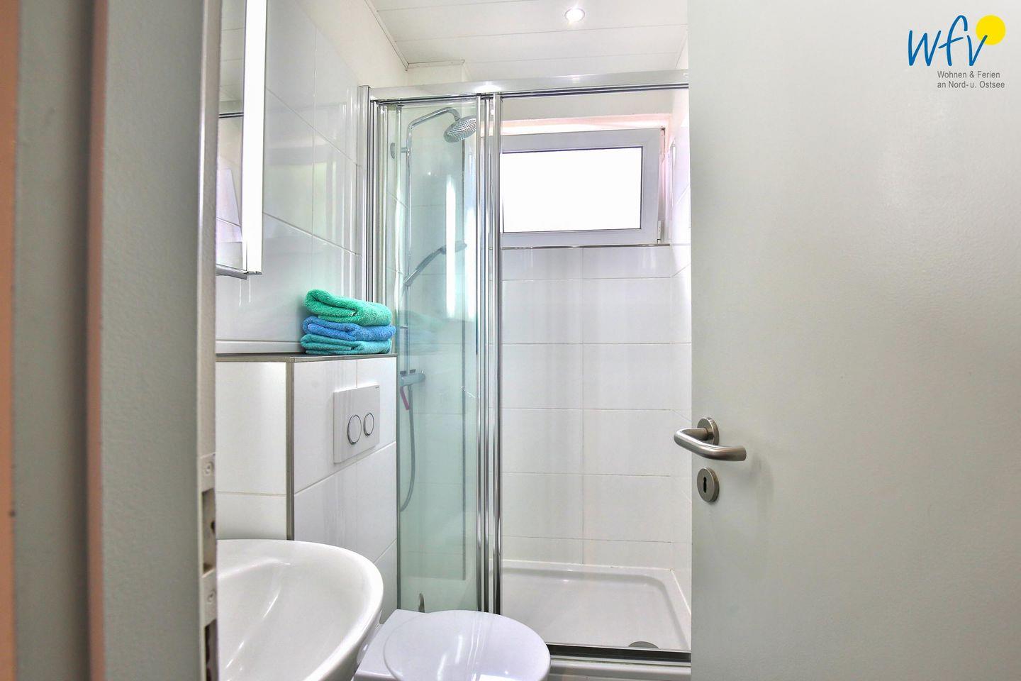 Das gepflegte Tageslichtbad mit Dusche, Föhn und beleuchtetem Spiegel bietet weiteren Komfort.