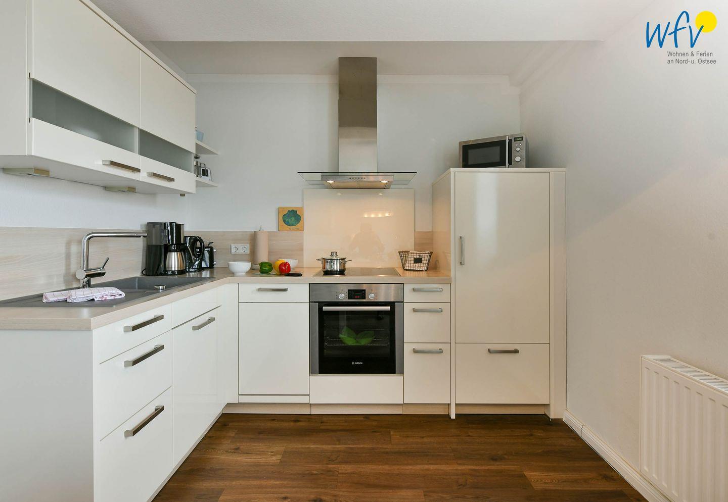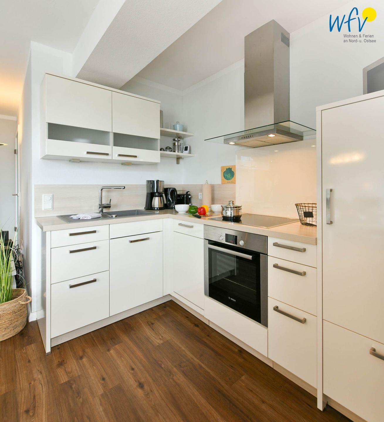 Im Urlaub wird auch das Kochen zum Genuss! In der offenen modernen Küche lassen sich bequem leckere Gerichte oder Snacks für zwischendurch zaubern. Während auf dem Ceranherd der knusprige Nordseefisch brutzelt, bräunen im Backofen die Rosmarinkartoffeln. Den Abwasch erledigt die Spülmaschine. So können Sie rundum eine Selbstversorgung mit frischen lokalen Produkten aus der Umgebung genießen.