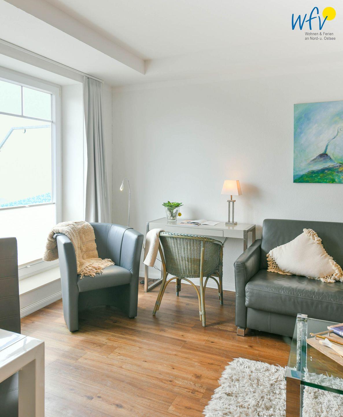 Die Ferienwohnung besticht durch ihr modernes und zugleich gemütliches Ambiente. Liebevolle maritime Accessoires sorgen für die persönliche Note. Der helle offene Wohnbereich lädt mit einer Sofaecke und einem Essbereich zum Entspannen nach dem ereignisreichen Urlaubstag ein. Ein modernes TV mit DVD-Player sorgt für Unterhaltung, zudem empfangen Sie kostenlos freies WLAN.