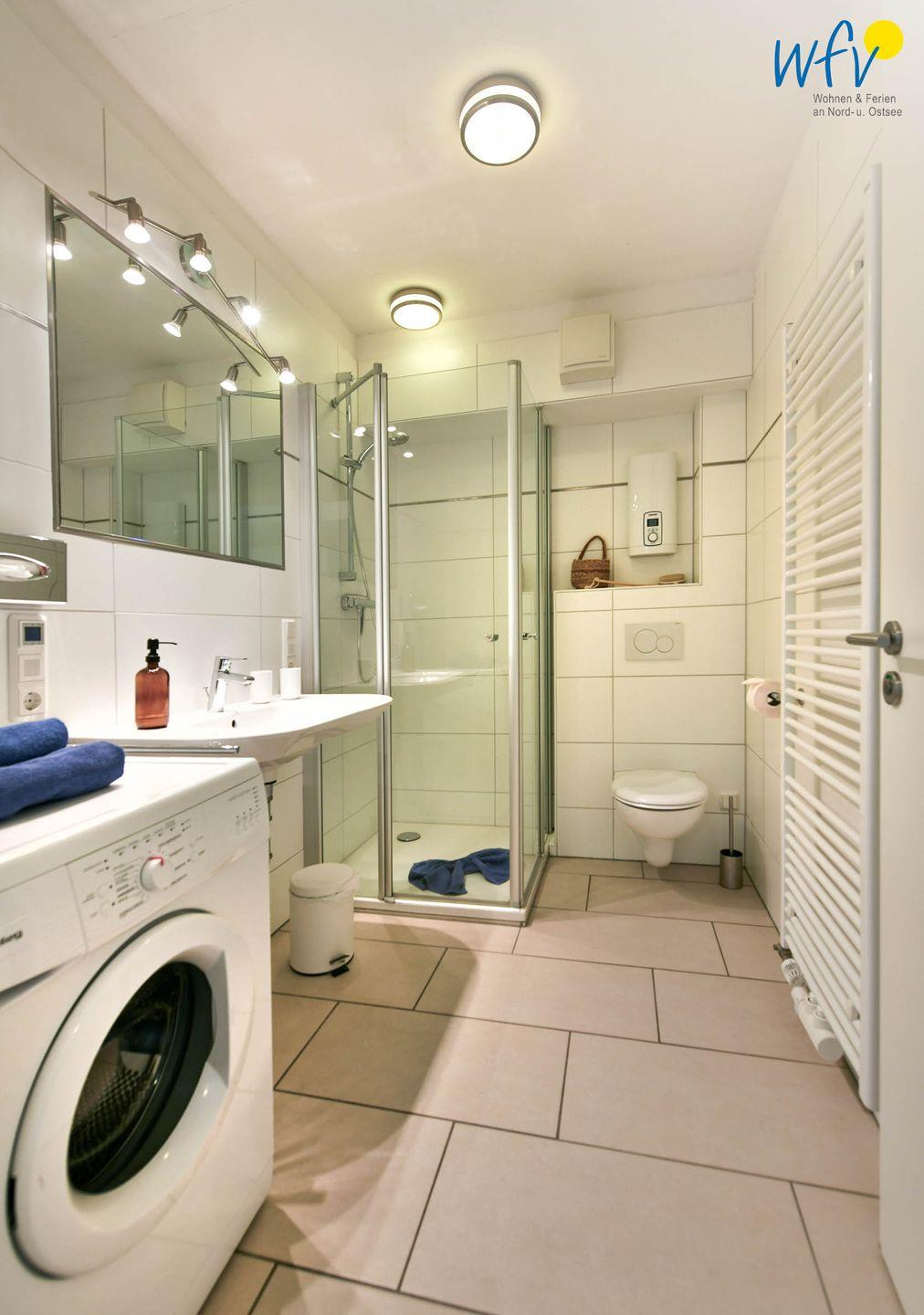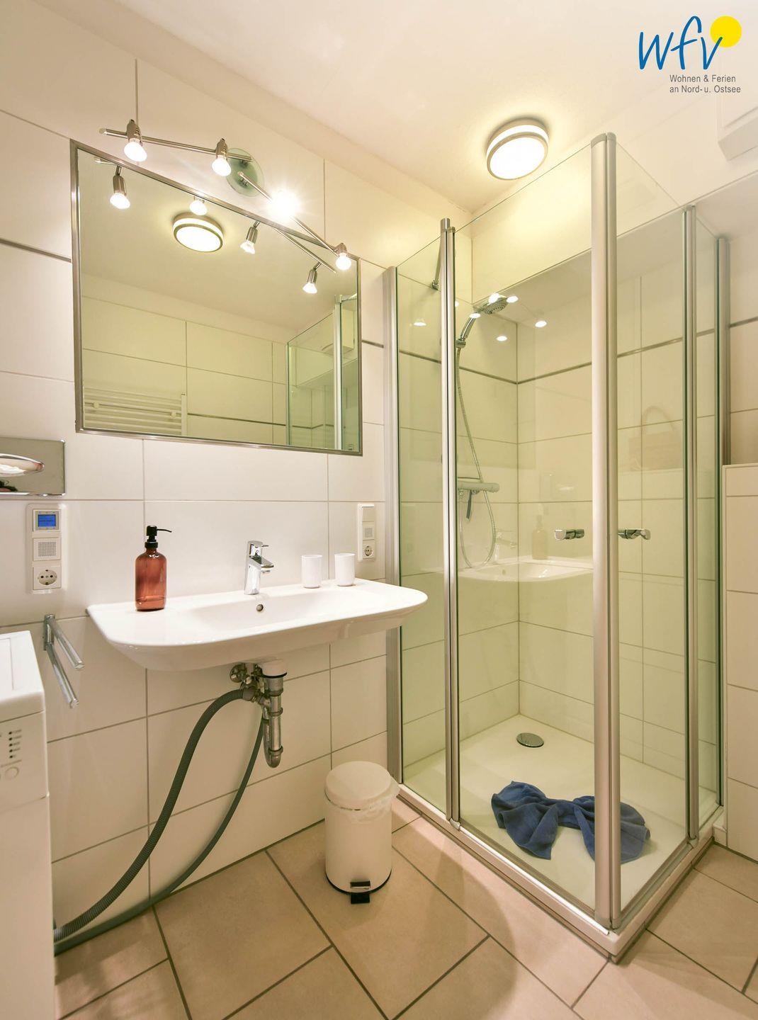 Weiteren Wohnkomfort bietet Ihnen das moderne Badezimmer mit Dusche, Handtuchheizung, Haartrockner und großem Spiegel. Hier steht Ihnen außerdem eine Waschmaschine zur Verfügung.