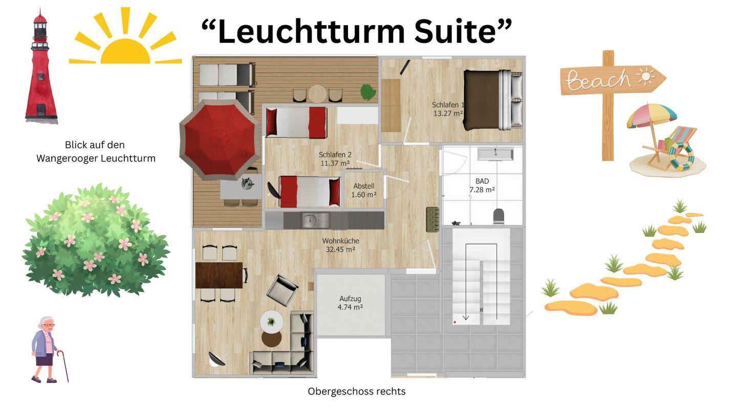 Willkommen in der "Ferienwohnung Leuchtturm Suite", einer komfortablen Unterkunft auf Wangerooge! Diese exklusive, familienfreundliche Wohnung bietet Ihnen einen traumhaften Wohlfühlort zum Ausspannen. Ein offener Wohnraum mit moderner Küche und 2 separate Schlafzimmer laden zum Erholen ein. Auch auf dem 15 m² großen Süd-/Westbalkon genießen Sie herrlich entspannte Stunden. Zur komfortablen Ausstattung gehören u.a. WLAN, TV`s und Fußbodenheizung. Wir wünschen Ihnen gute Erholung nah am Meer!