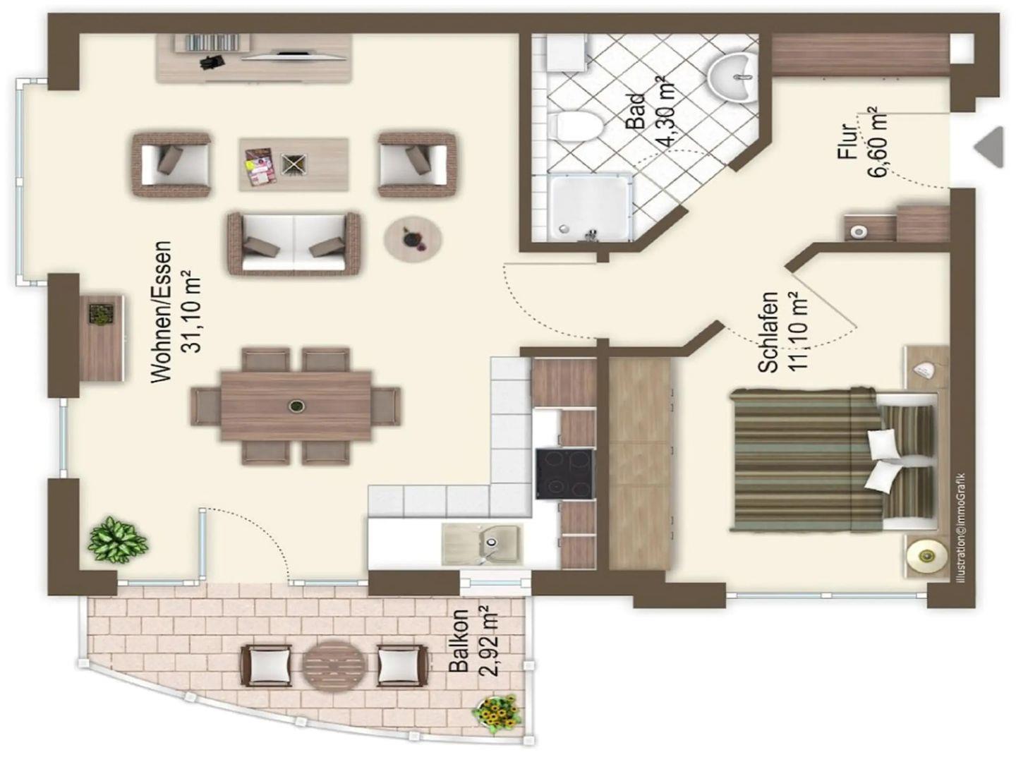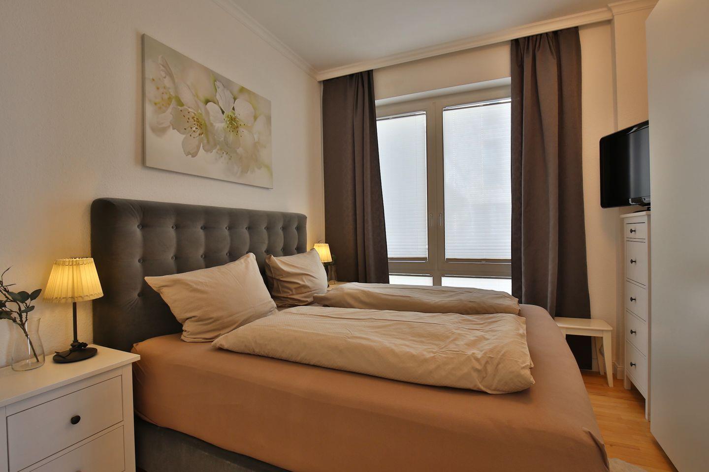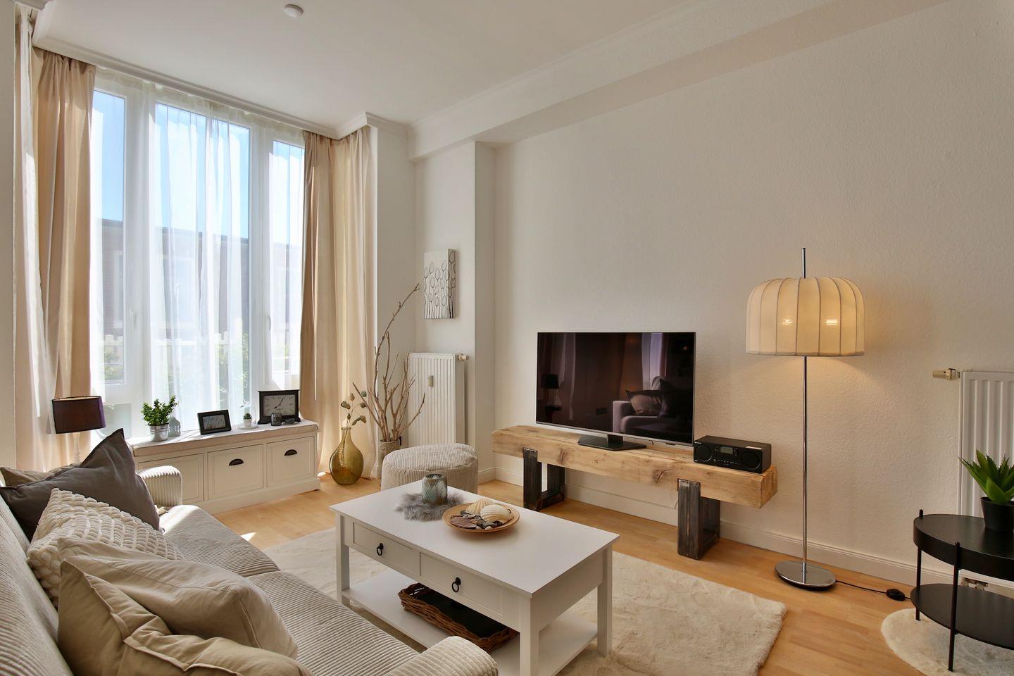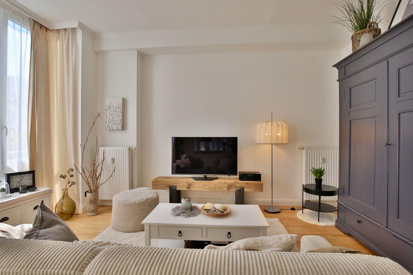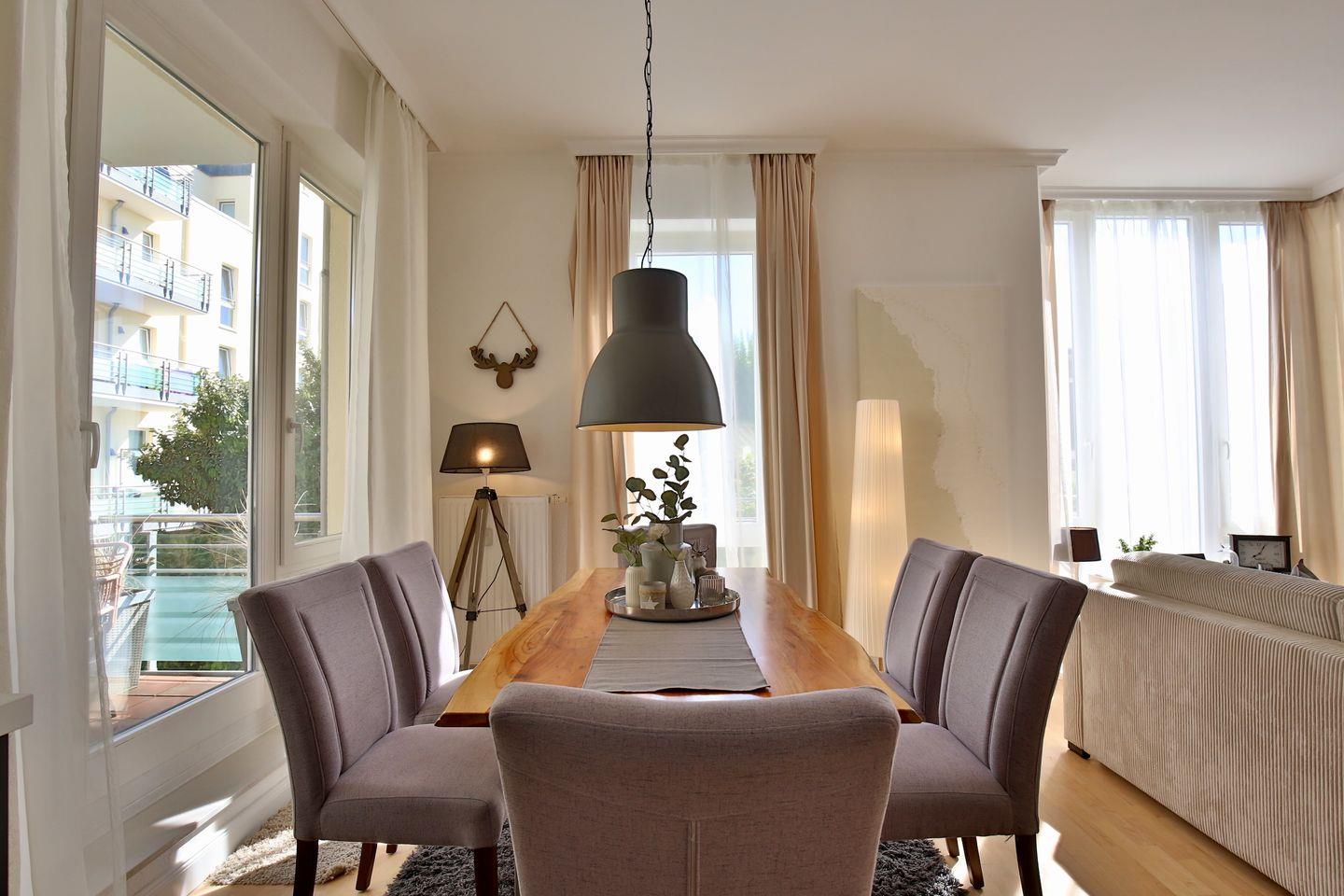 Die Wohnung bietet auf einer Fläche von 56 m² alles, was Sie für einen entspannten Aufenthalt benötigen. Sie verfügt über ein Schlafzimmer, in dem zwei Personen komfortabel schlafen können, ein modernes Badezimmer sowie einen einladenden Wohn-/ und Essbereich mit einem gemütlichen Sofa und einem Esstisch vor der offenen Küche. Ein TV und kostenloses WLAN sind ebenfalls vorhanden, sodass Sie auch in Ihrer Freizeit bestens unterhalten sind.