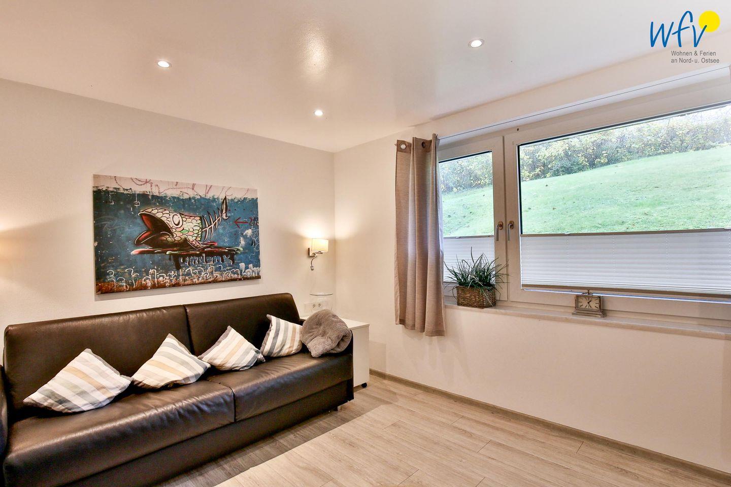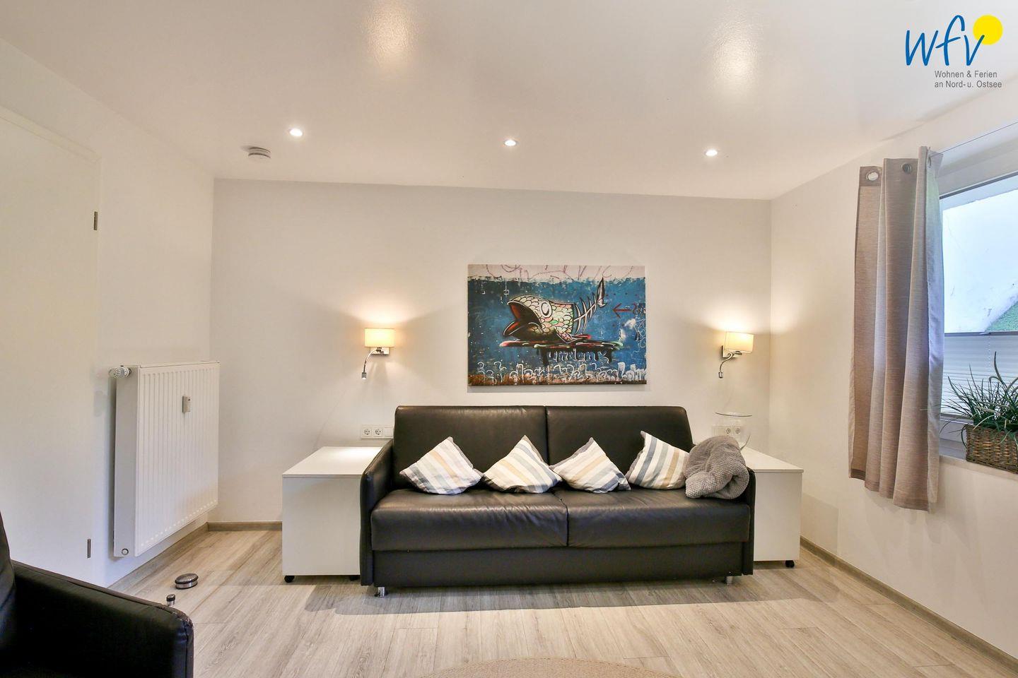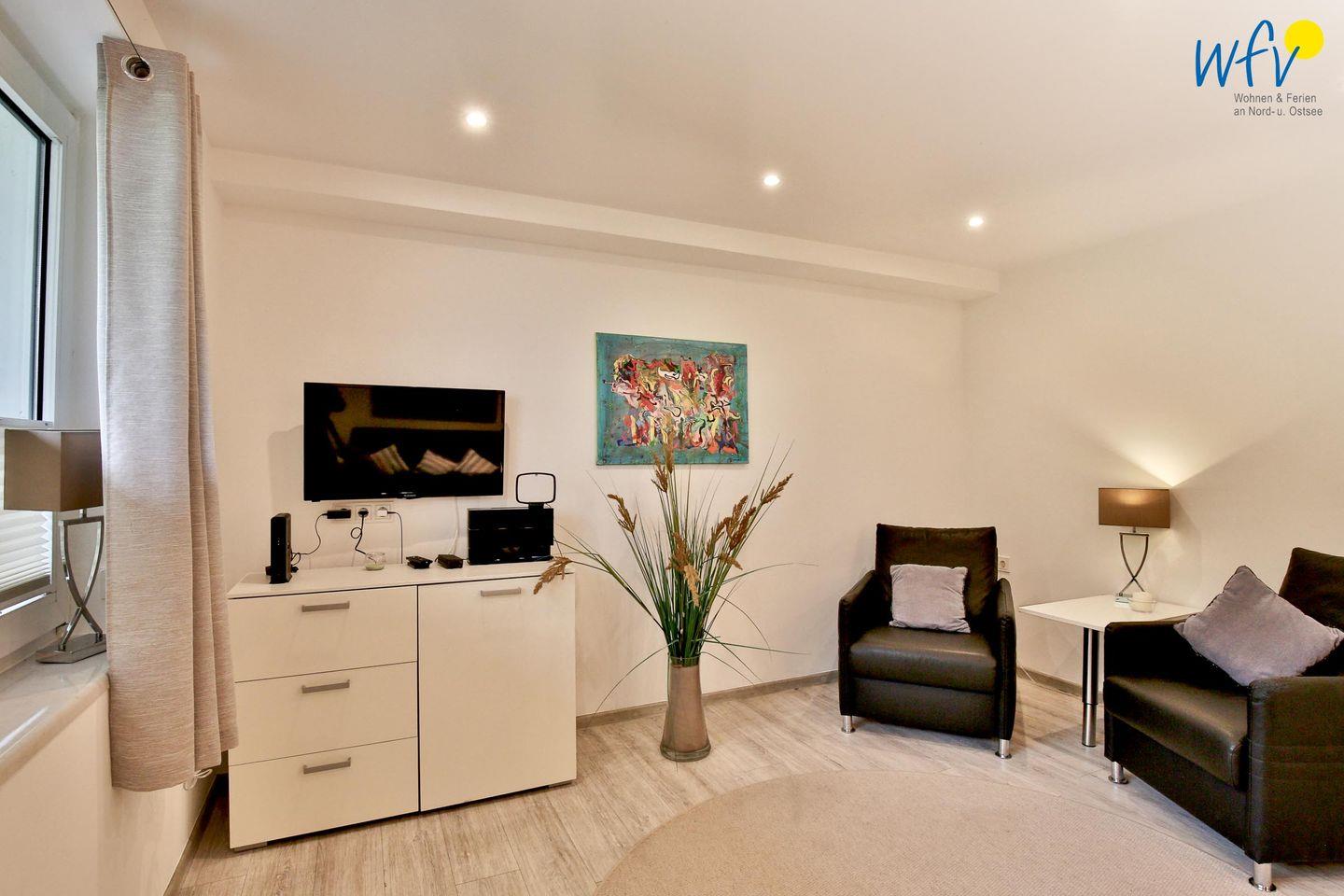 Nach dem Strandtag oder dem Inselspaziergang lädt der Wohnraum zu Entspannungs- und Wohlfühlmomenten ein! Mit einer bequemen Sitzecke sowie einem modernen TV mit Blu-ray-Player/DVD-Player und einer kleinen HiFi-Anlage ist es ein gemütlicher Platz zum Filme schauen, Musik hören oder zum geselligen Beisammensein. Für das Surfen vom Smartphone aus empfangen Sie kostenlos freies WLAN.