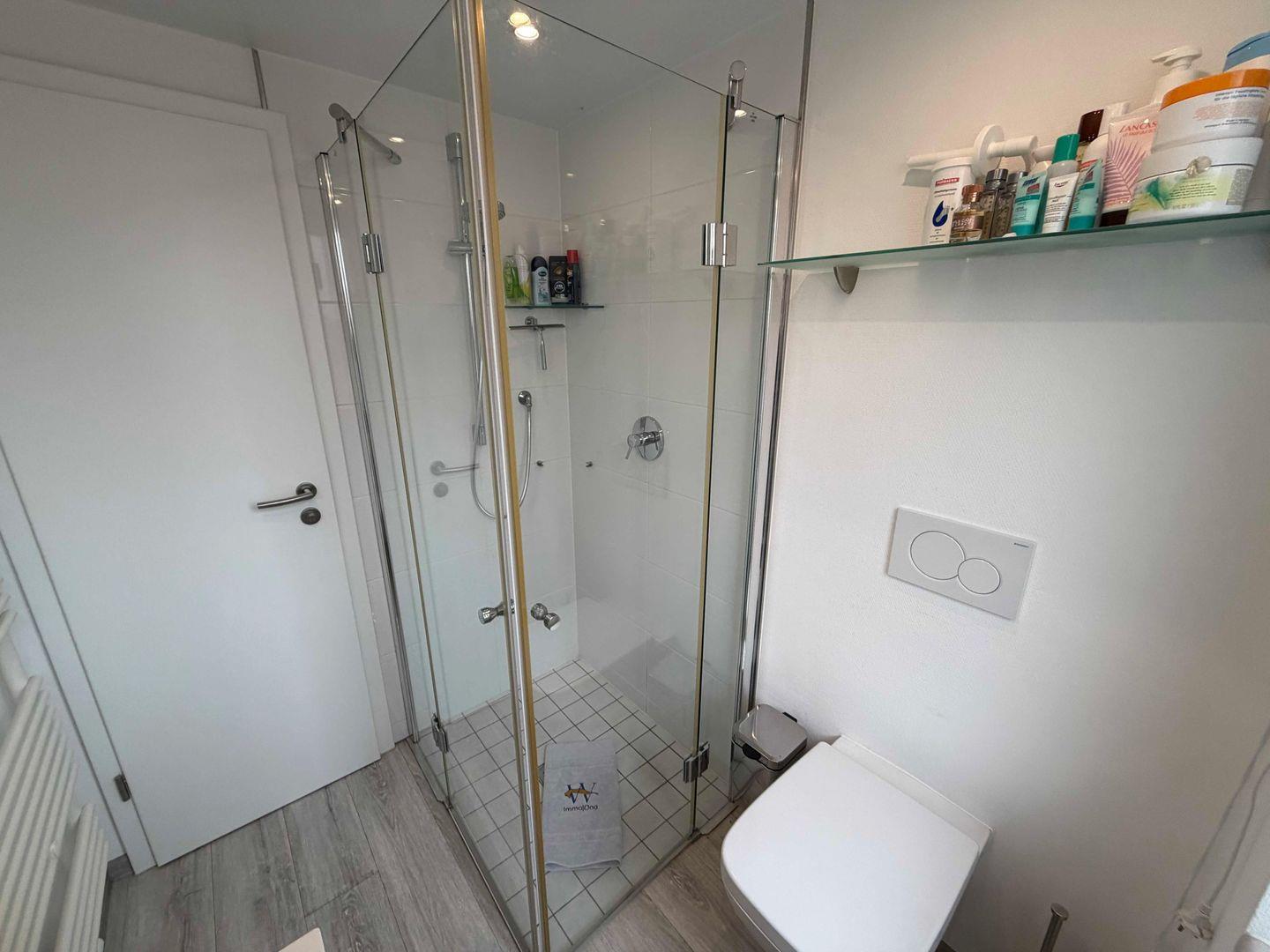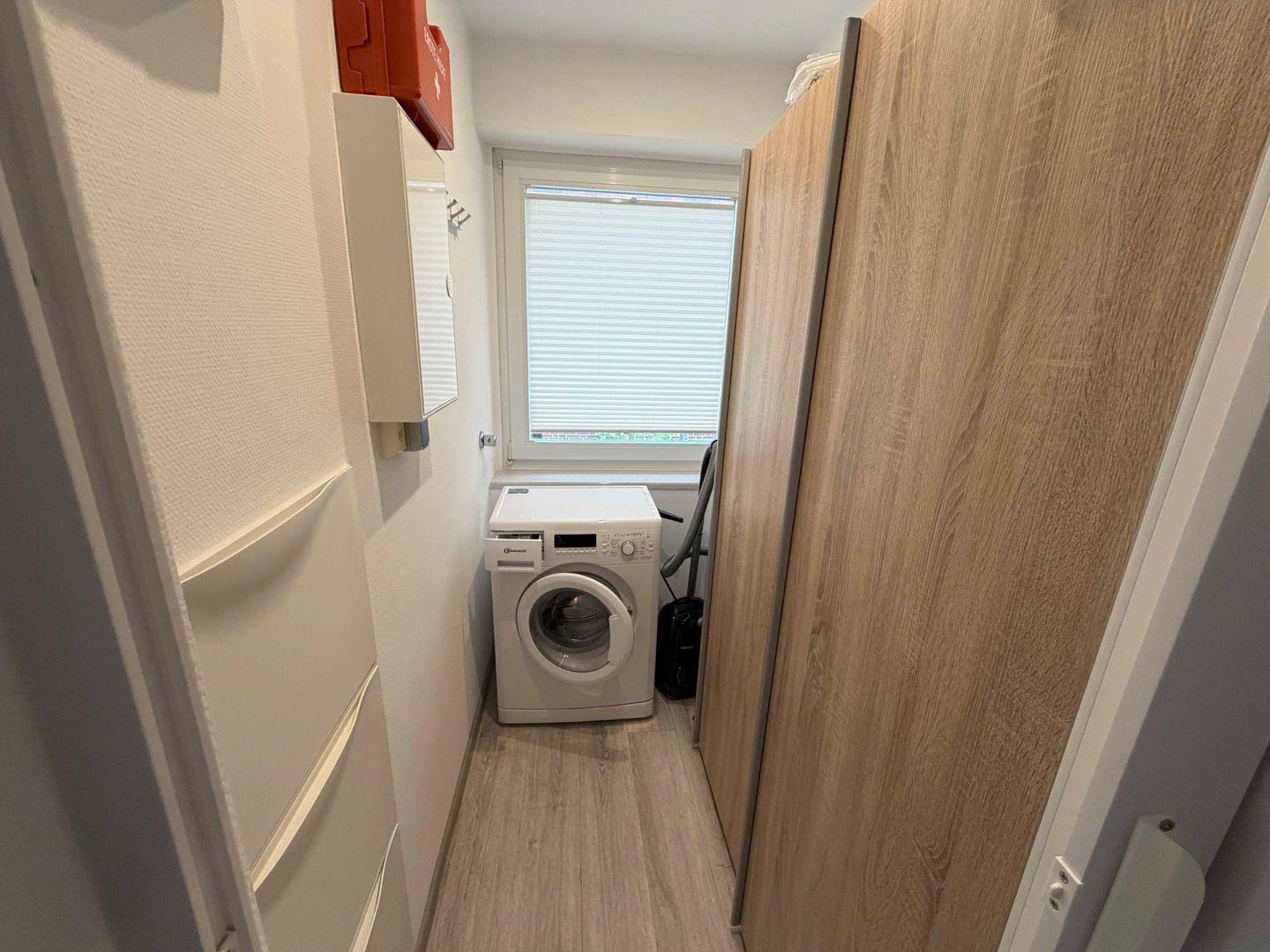 Das Badezimmer ist funktional und modern eingerichtet. Es verfügt über eine bodengleiche Dusche, WC, Waschbecken, Spiegel, Kosmetikspiegel, Fenster sowie einen Haartrockner. Eine Waschmaschine, Wäscheständer und Staubsauger stehen für den täglichen Gebrauch bereit und unterstreichen die praktische Ausrichtung dieser Unterkunft.