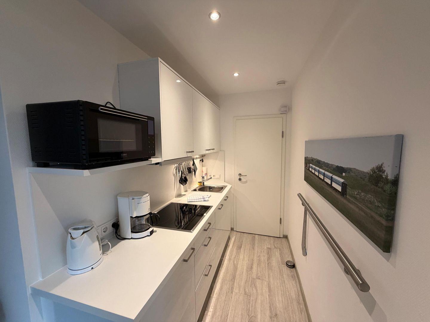 Die Küche ist umfassend ausgestattet und eignet sich besonders für längere Aufenthalte: Cerankochfeld, Backofen, Mikrowelle, Kühlschrank mit Gefrierfach, Spülmaschine, Eierkocher, Wasserkocher, Toaster, Mixer und eine Vielzahl an Küchenutensilien sowie Geschirr und Besteck lassen keine Wünsche offen.