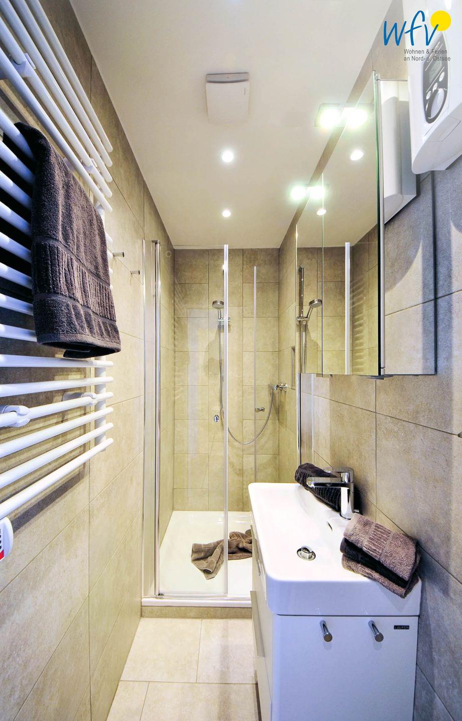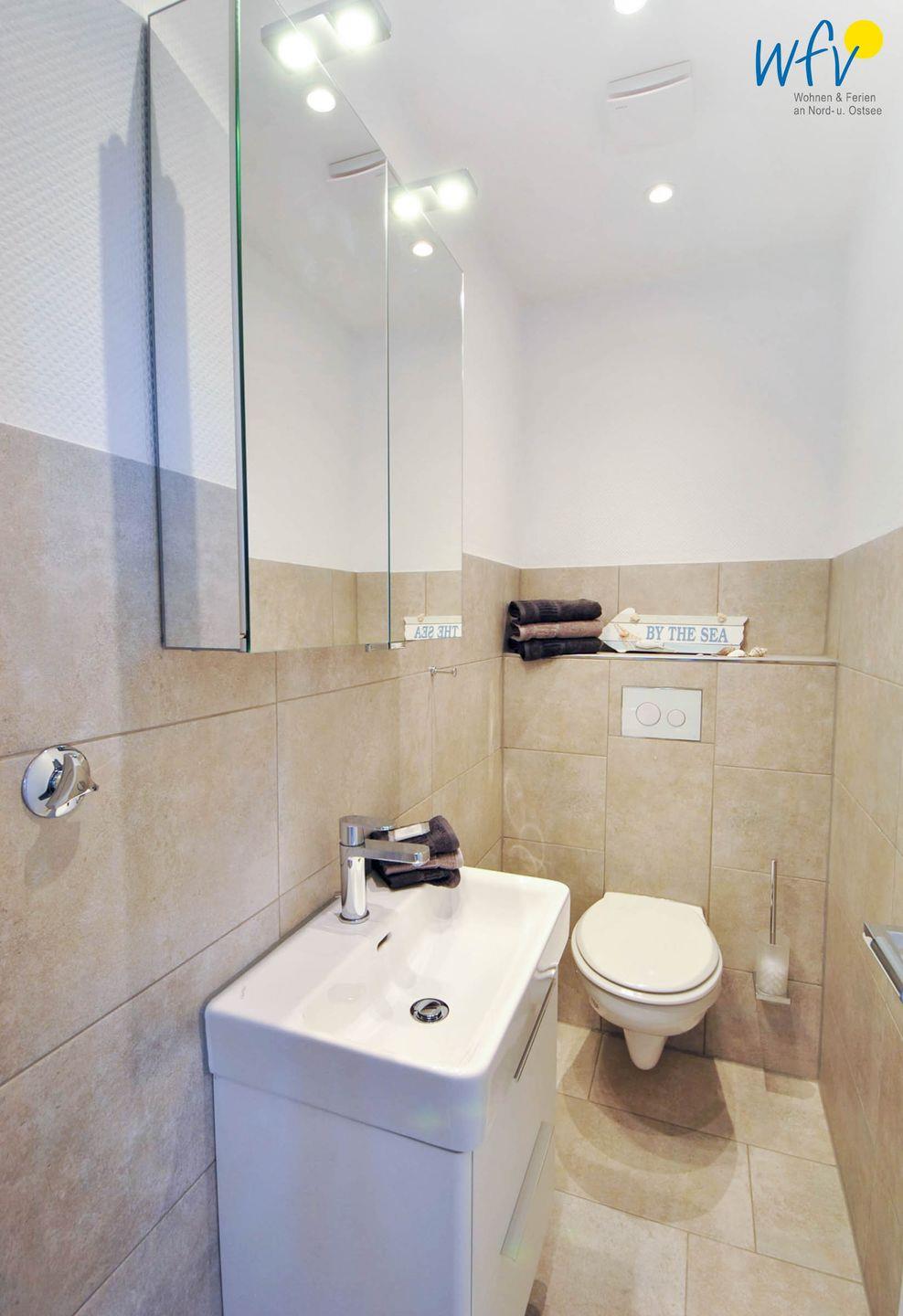 Ein elegantes Badezimmer - u.a. mit bodentiefer Dusche, großem Spiegelschrank und Handtuchheizung - ergänzt den Wohnkomfort. Separat befindet sich das WC in einem kleinen Bad gegenüber, das ebenfalls mit einem großen Spiegelschrank und einer Handtuchheizung ausgestattet ist.