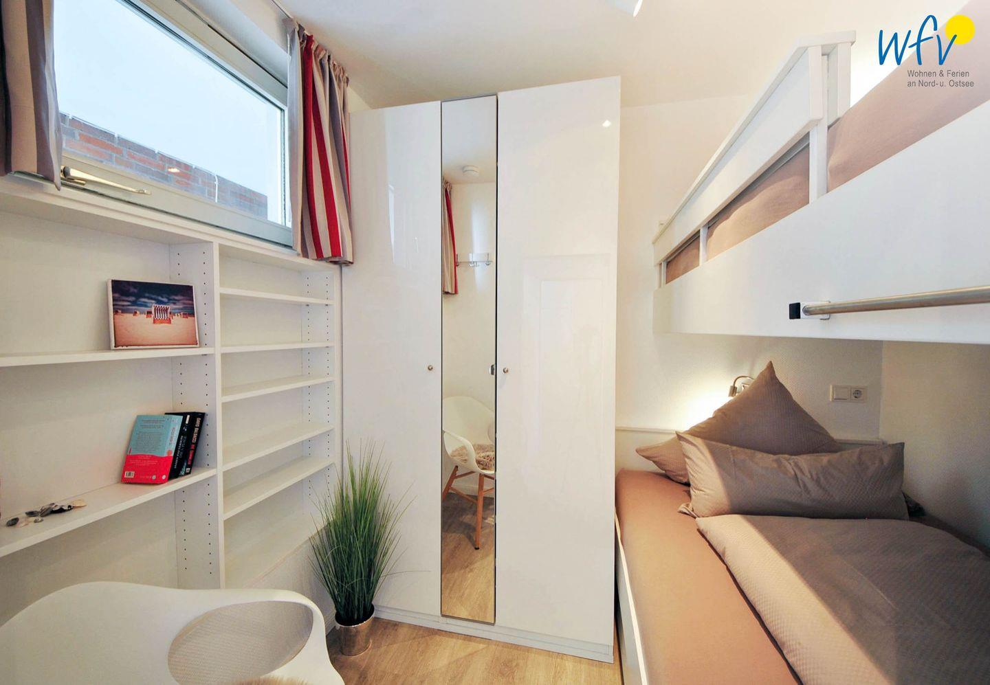 Die "Ferienwohnung Strandkieker" verfügt über zwei freundlich eingerichtete separate Schlafzimmer. Eines der Zimmer ist mit einem Einzelbett ausgestattet (100 x 200 cm), des Weiteren befindet sich in diesem Zimmer ein komfortables Schrankbett (80 x 190 cm). Das andere Zimmer ist mit einem Etagenbett eingerichtet, bei dem die untere Liegefläche 120 x 200 cm und die obere Liegefläche 100 x 200 cm beträgt. Für Ihre Urlaubsgarderobe, Koffer etc. stehen Ihnen geräumige Kleiderschränke und weitere Aufbewahrungsmöglichkeiten innerhalb der Wohnung zu Verfügung.