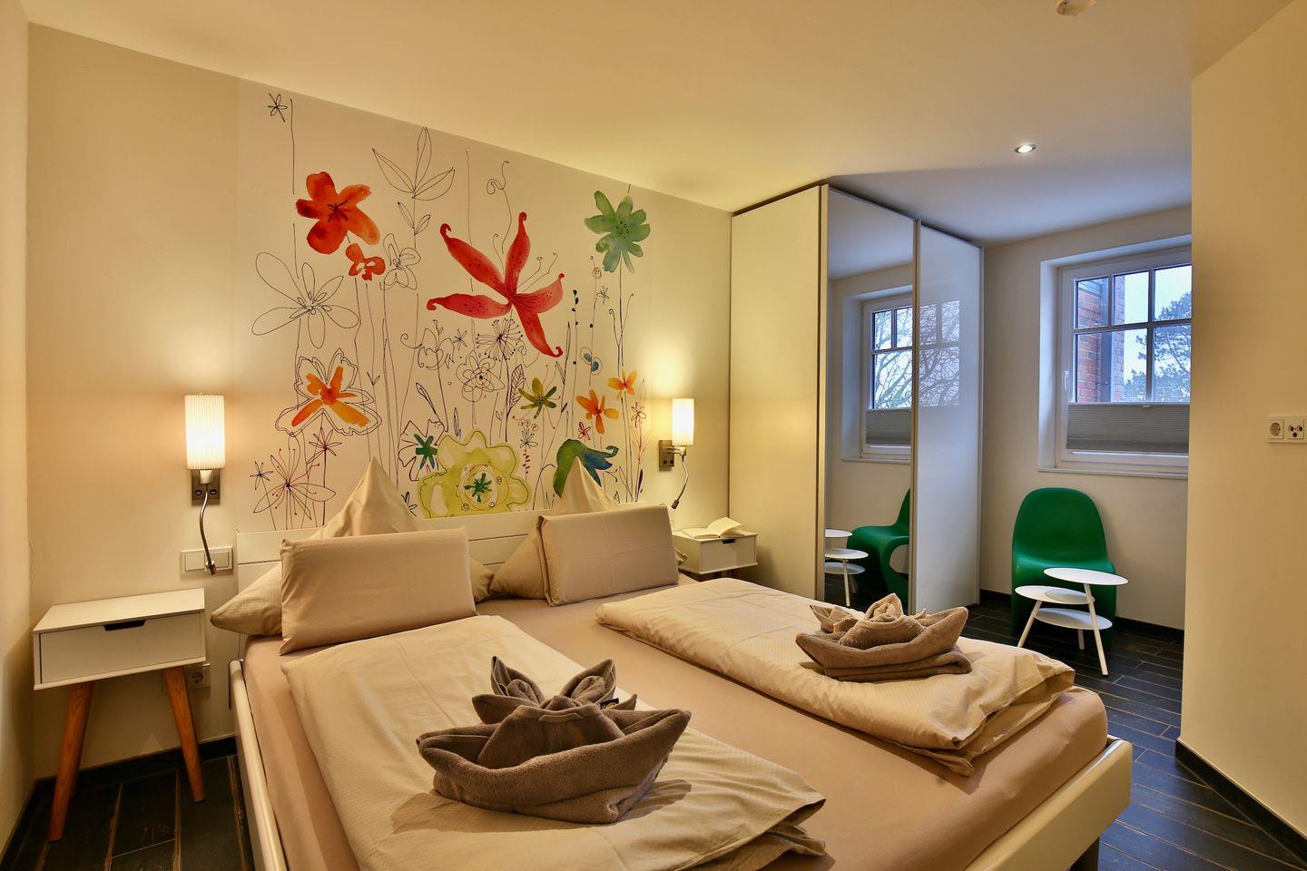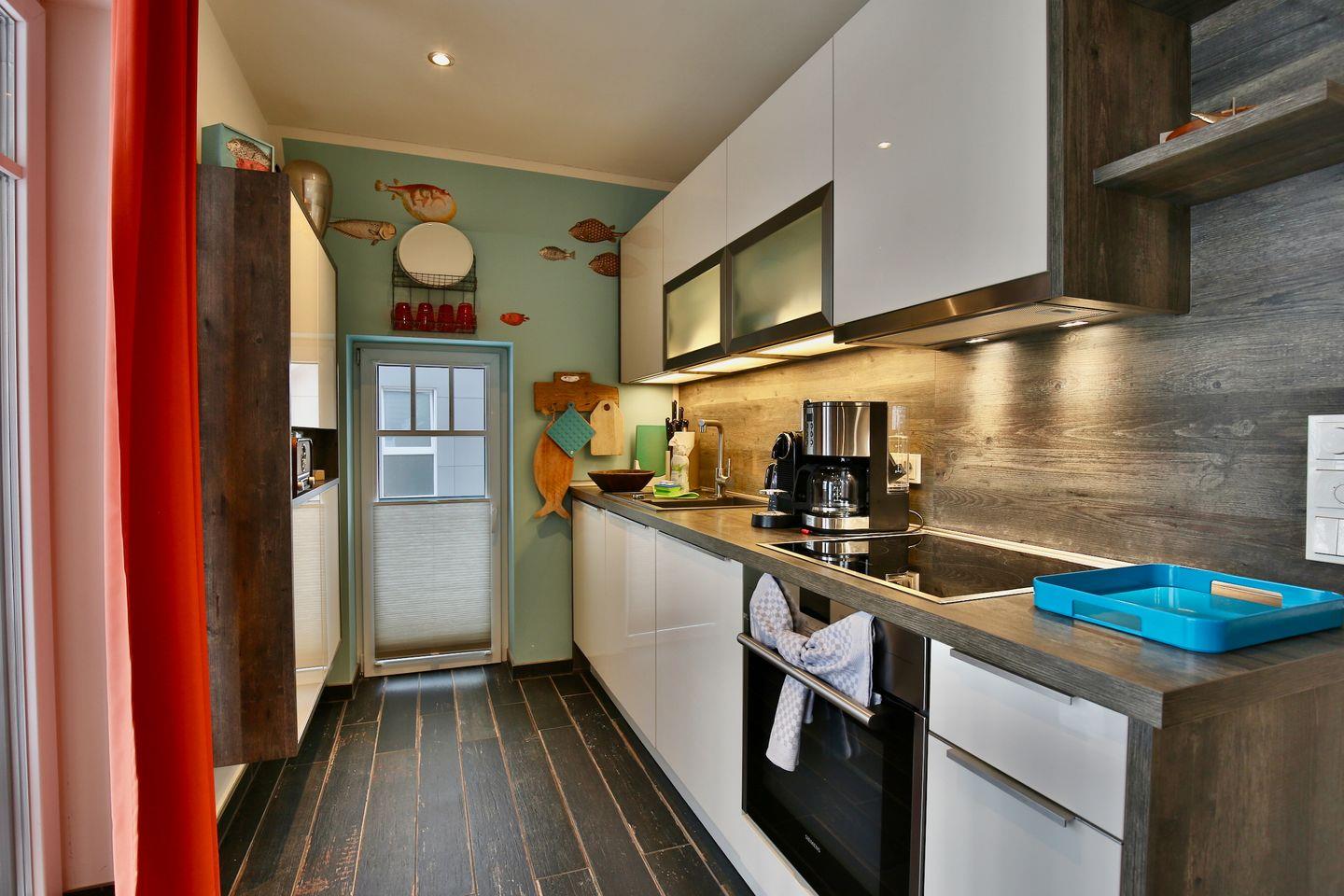 Die Ferienwohnung ist für bis zu vier Personen geeignet und verfügt über zwei separate Schlafzimmer. Für Familien mit kleinen Kindern stehen sowohl ein Babybett als auch ein Kinderhochstuhl auf Wunsch bereit. Im lichtdurchfluteten Wohnbereich lädt eine gemütliche Sofaecke zum Entspannen ein. Die offene, zum Wohnzimmer hin integrierte Küche ist umfassend ausgestattet und verfügt über einen Herd mit Elektrobackofen, Kühlschrank und sämtliches Kochzubehör, das Sie für die Zubereitung gemeinsamer Mahlzeiten benötigen. Am Esstisch im Essbereich finden alle Gäste bequem Platz, um den Tag bei einem ausgedehnten Frühstück oder einem gemütlichen Abendessen ausklingen zu lassen.