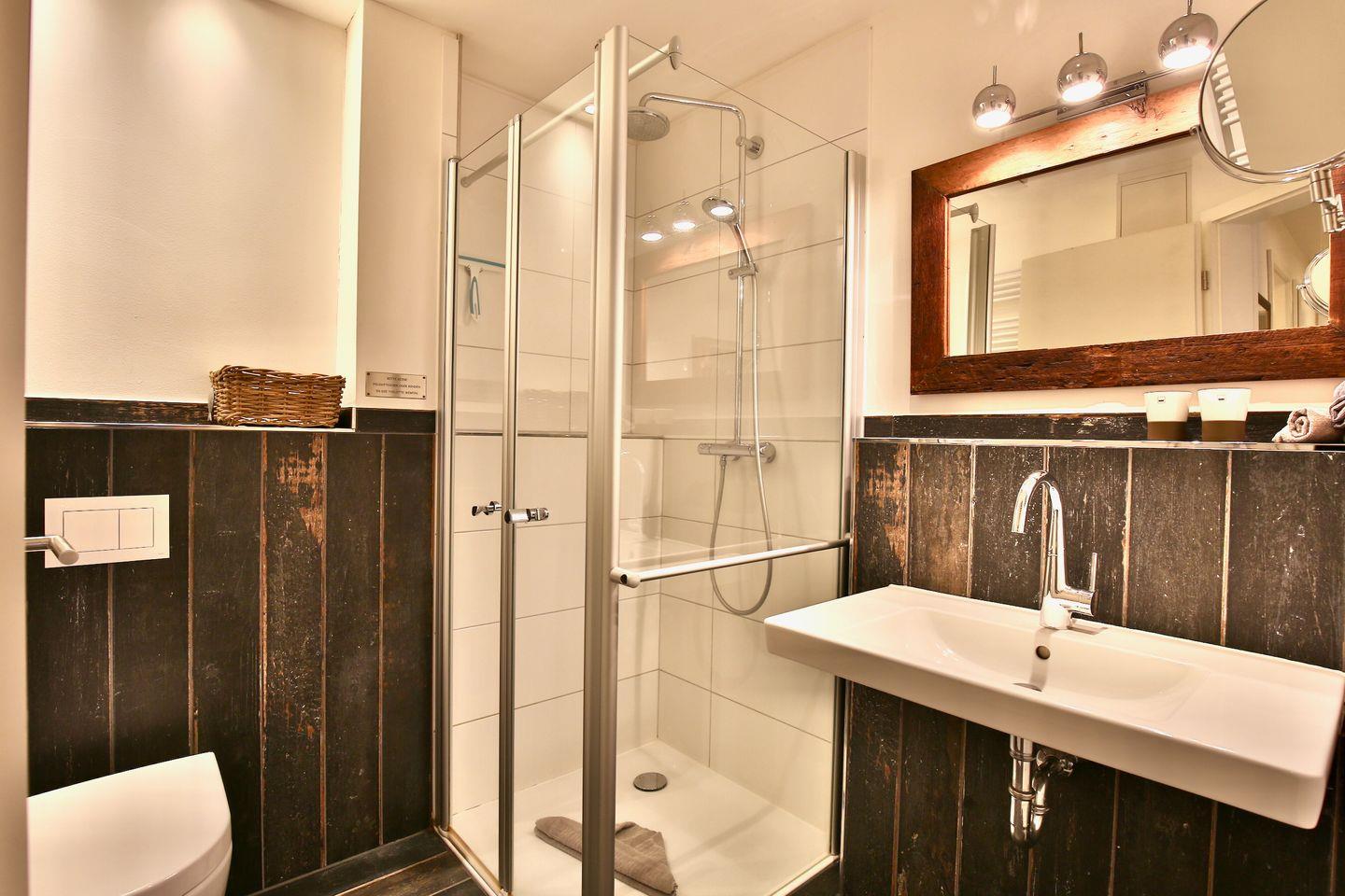 Das Badezimmer ist modern gestaltet und bietet neben einer bodengleichen Dusche auch einen Haartrockner, Waschbecken, Spiegel sowie einen separaten Kosmetikspiegel. Für Ihren Komfort werden Handtücher, Bettwäsche und eine Erstausstattung an Pflegeprodukten bereitgestellt. Eine Waschmaschine und ein Trockner, die Sie jeweils zur Eigennutzung in der Wohnung vorfinden, ermöglichen Ihnen auch längere Aufenthalte mit allem nötigen Komfort.