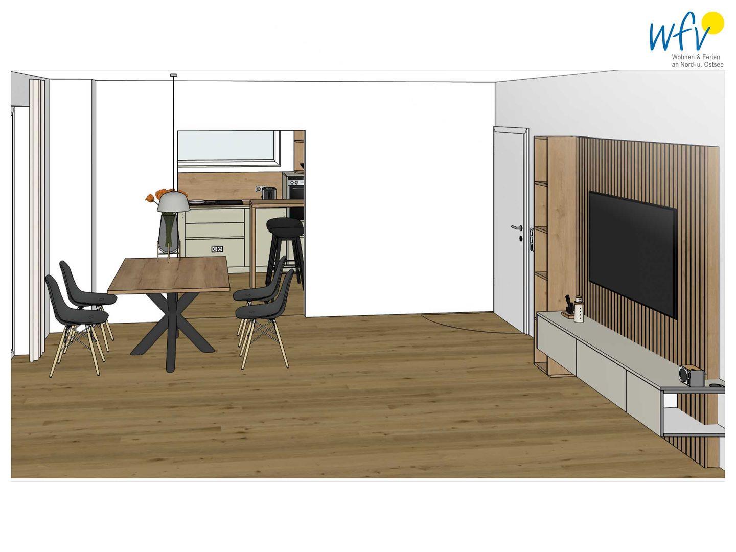 Schlicht und elegant lädt das Wohnzimmer mit bequemem Sofa und großem Esstisch zum Relaxen, zu gemütlichen Fernsehabenden und zu gemeinsamen Mahlzeiten ein. Von hier aus gelangen Sie auf den Balkon mit malerischem Blick in Wangerooges weite Dünenlandschaft - perfekt zum Ausspannen, Lesen oder Beisammensein.