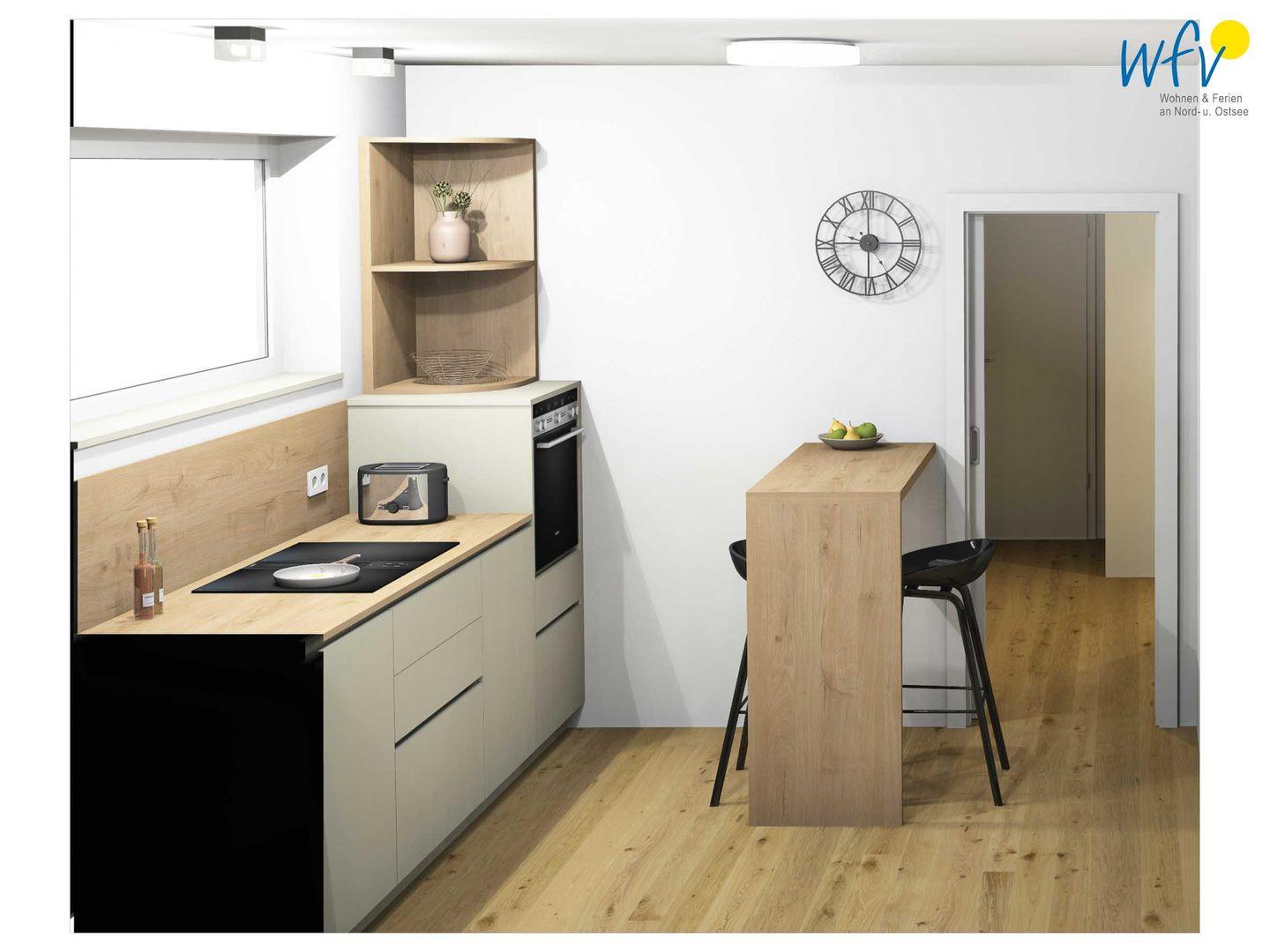 Die Küche der Ferienwohnung "Dünenfriese" ist bestens ausgestattet und lässt auch im Urlaub die Kochfreunde zu wahren Gourmets werden. Sie verfügt u.a. über einen großen Kühlschrank und Markengeräte. Ihren ersten Morgenkaffee können Sie in Ruhe am Küchentresen mit schönem Blick in die Umgebung genießen. Dazu wählen Sie zwischen einer Nespresso- oder einer Filter-Kaffeemaschine. Für Teeliebhaber steht für den langen Genuss ein Stövchen bereit.