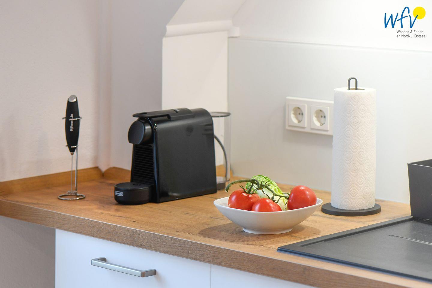 Die Küche ist umfassend eingerichtet und unterstützt eine flexible Selbstversorgung. Dazu gehören Herd, Backofen, Mikrowelle, Kühlschrank, Spülmaschine, Kaffeemaschine, Wasserkocher, Toaster und Mixer. Ein Esstisch lädt zu gemeinsamen Mahlzeiten in geselliger Runde ein. Auch für längere Aufenthalte ist die Ausstattung durchdacht: Waschmaschine und Trockner stehen gemeinschaftlich zur Nutzung bereit, ebenso Bügeleisen, Bügelbrett, Wäscheständer und Staubsauger.