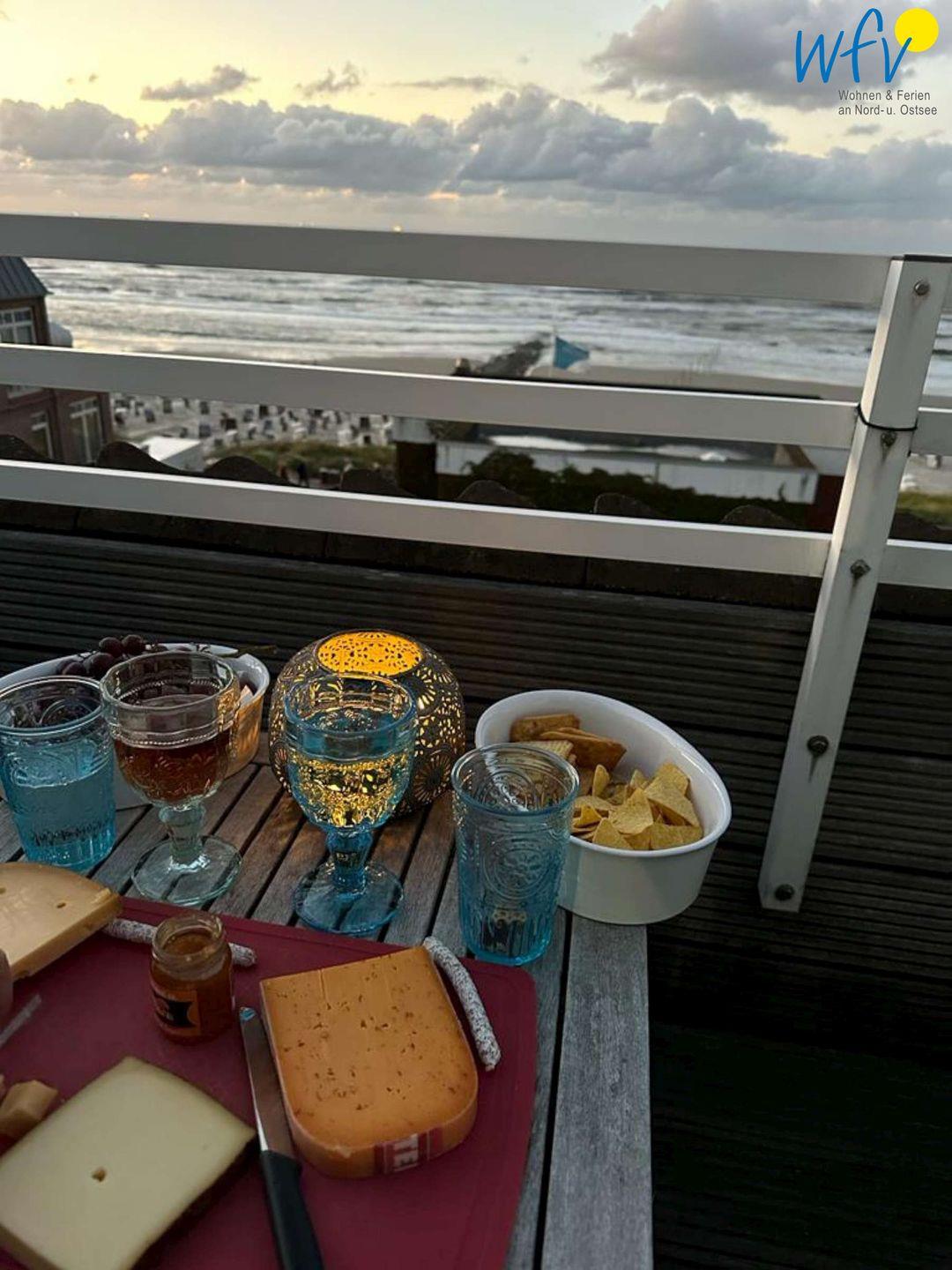 Schon beim Eintritt in die Wohnung haben Sie den wunderbaren Blick auf das Meer. Vom gemütlichen Esszimmertisch aus und auch vom Balkon kann man an 365 Tagen im Jahr und zu jeder Tages- und Nachtzeit den Blick auf das sich immer ändernde Aussehen der Nordsee genießen. Die Möglichkeit zu haben, durch das große Rundbogenfenster diesem Naturspiel des Meeres zuzusehen, ist einzigartig. Wetterunabhängig, also ohne die Wohnung bei schlechtem Wetter überhaupt verlassen zu müssen, können Sie an jedem Tag des Jahres und zu jeder Stunde den Blick auf den Strand und das Meer genießen und dem Meeresrauschen zuhören. Das ist Erholung pur. Was will man mehr, als die Seele so baumeln zu lassen...