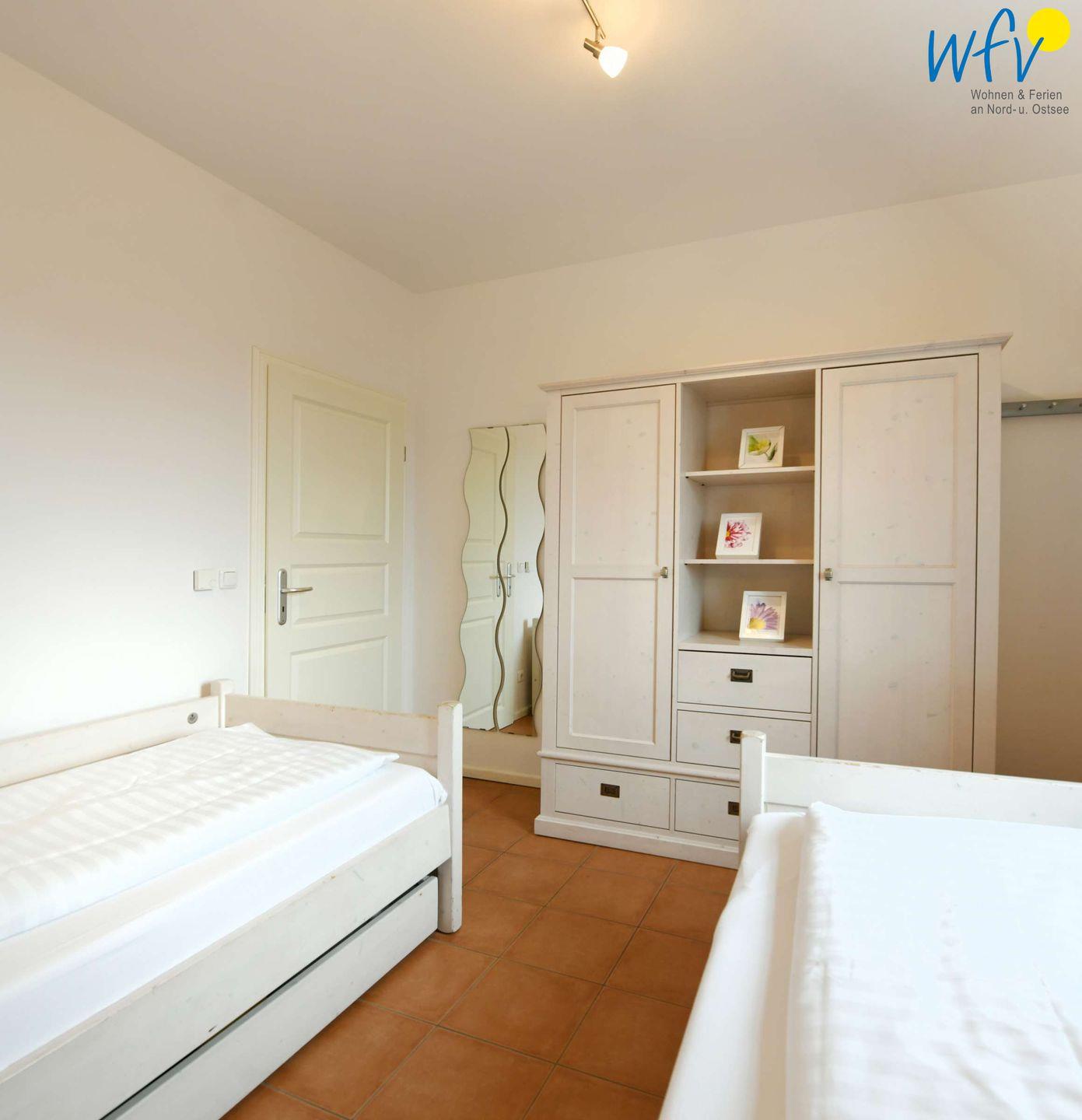 Die zwei separaten Schlafräume dieser Wangerooger Ferienwohnung sind mit einem Doppelbett bzw. zwei Einzelbetten und einem vollwertigen Ausziehbett ausgestattet. Ein Kinderbett und ein Hochstuhl gehören in dieser Ferienwohnung zur festen Ausstattung und stehen Ihnen ohne Aufpreis zur Verfügung.