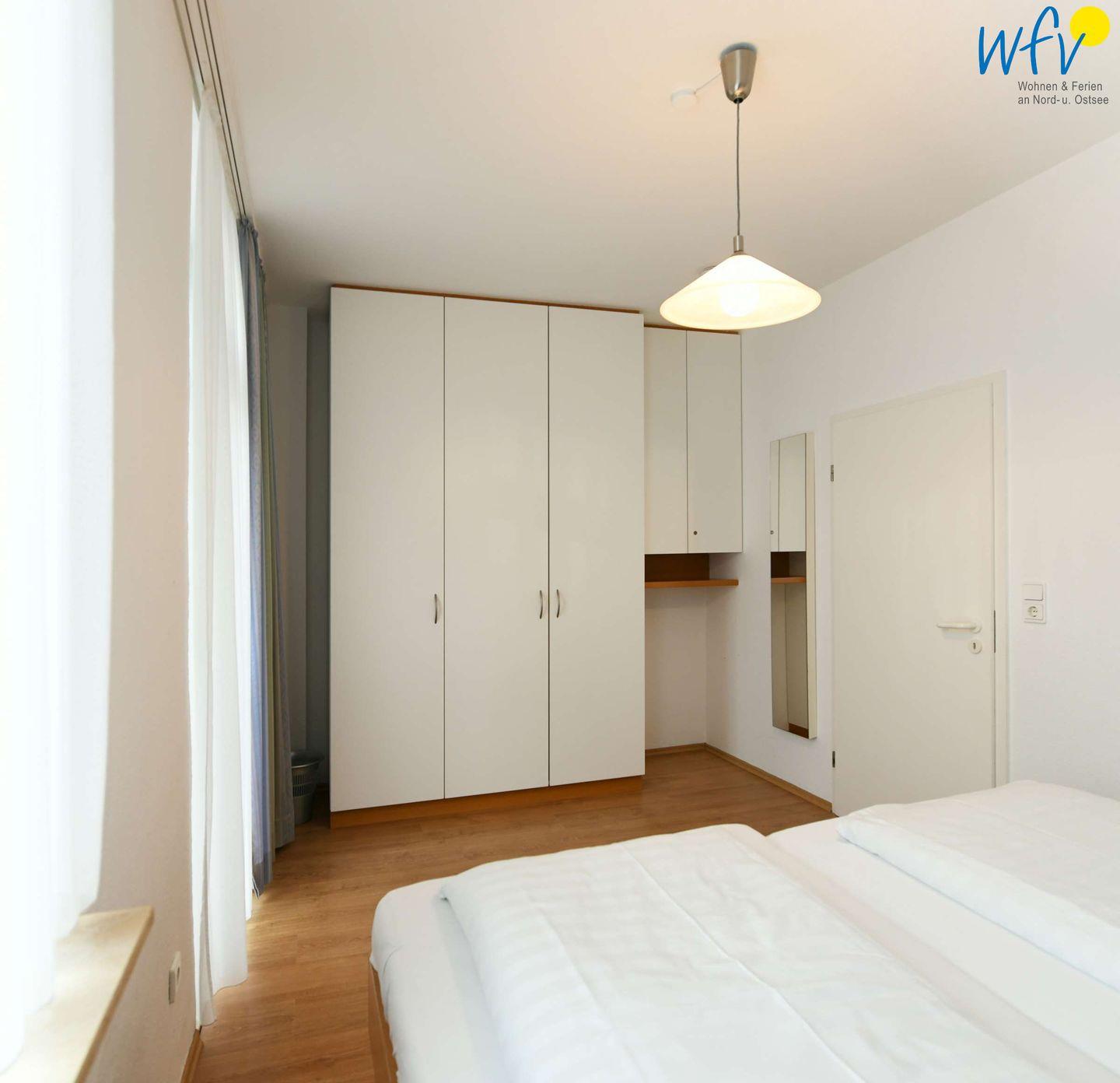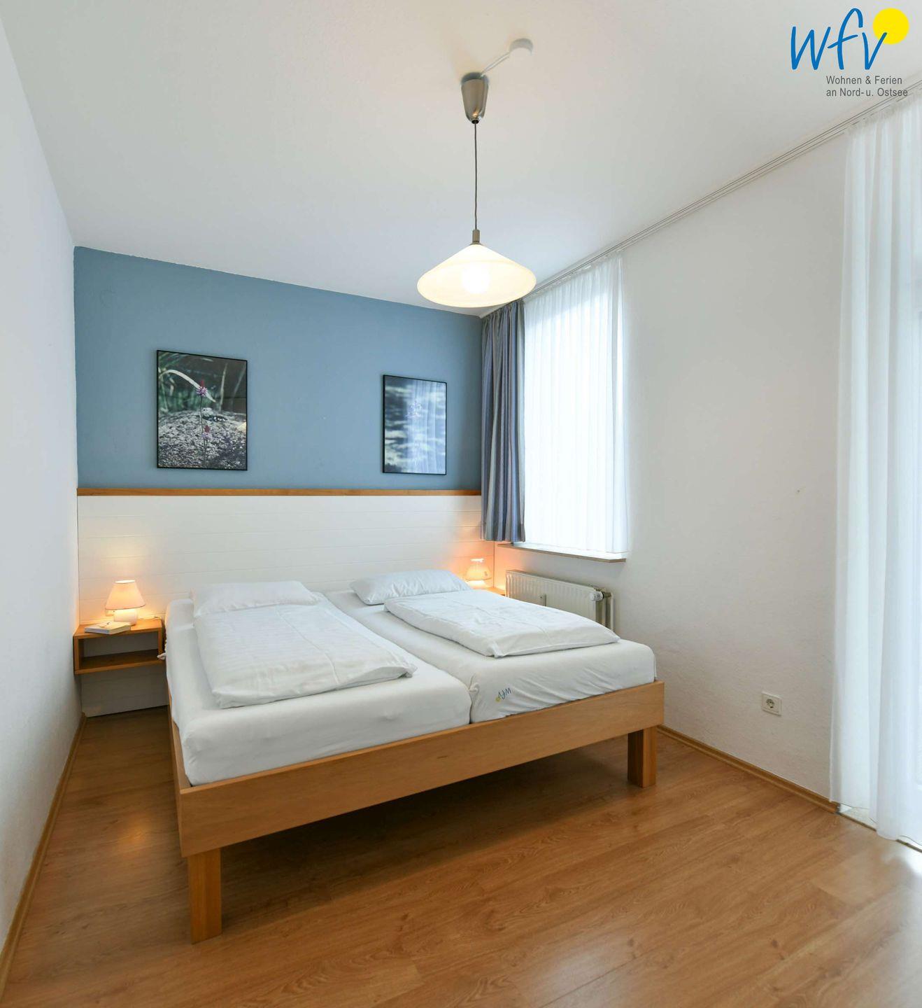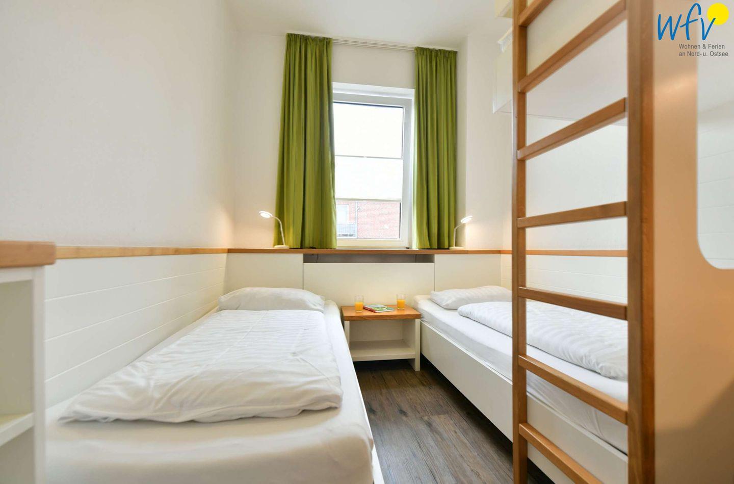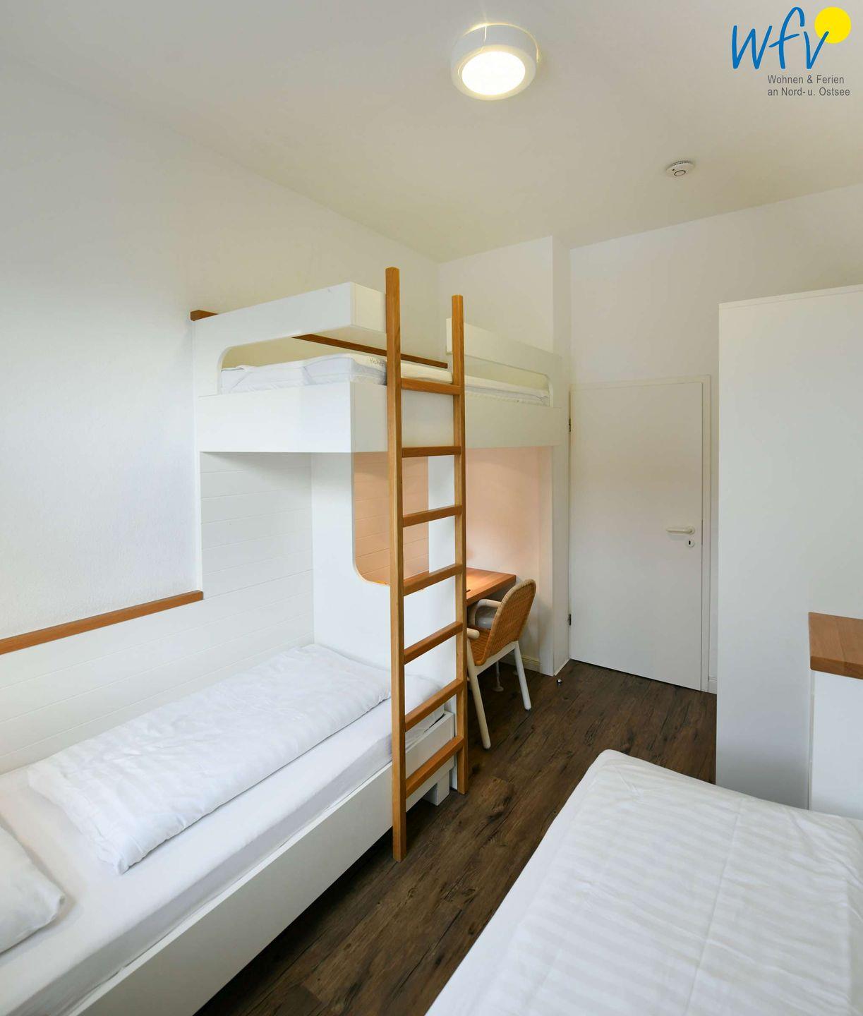 Gute Aufteilungs- und Rückzugsmöglichkeiten bieten die zwei separaten Schlafzimmer der Wangerooger Ferienwohnung. Sie sind mit einem Doppelbett und zwei Einzelbetten sowie einem Hochbett für eine Person ausgestattet.
