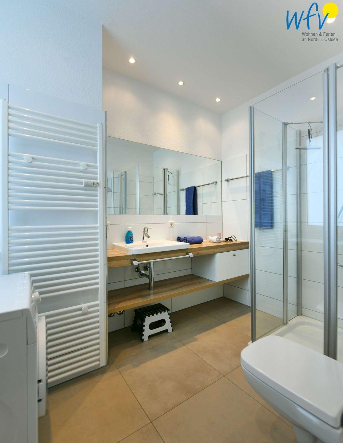 Das moderne Bad mit Dusche, Handtuschheizung und großem Spiegel vervollständigt den Wohnkomfort.
