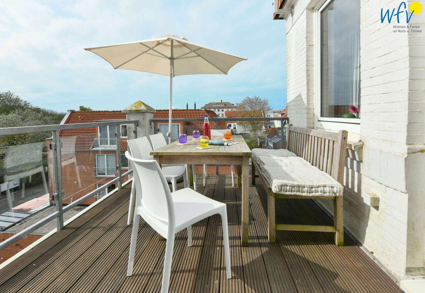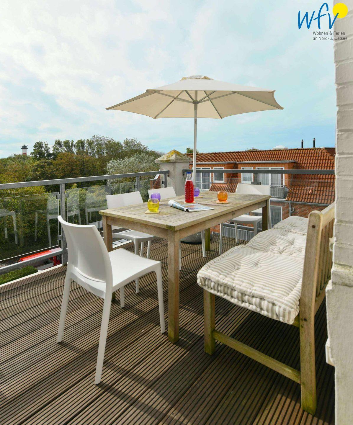 Besonders schön ist der Balkon der Wangerooger Ferienwohnung! Von hier aus haben Sie einen malerischen Blick auf den Rosengarten und den Leuchtturm.