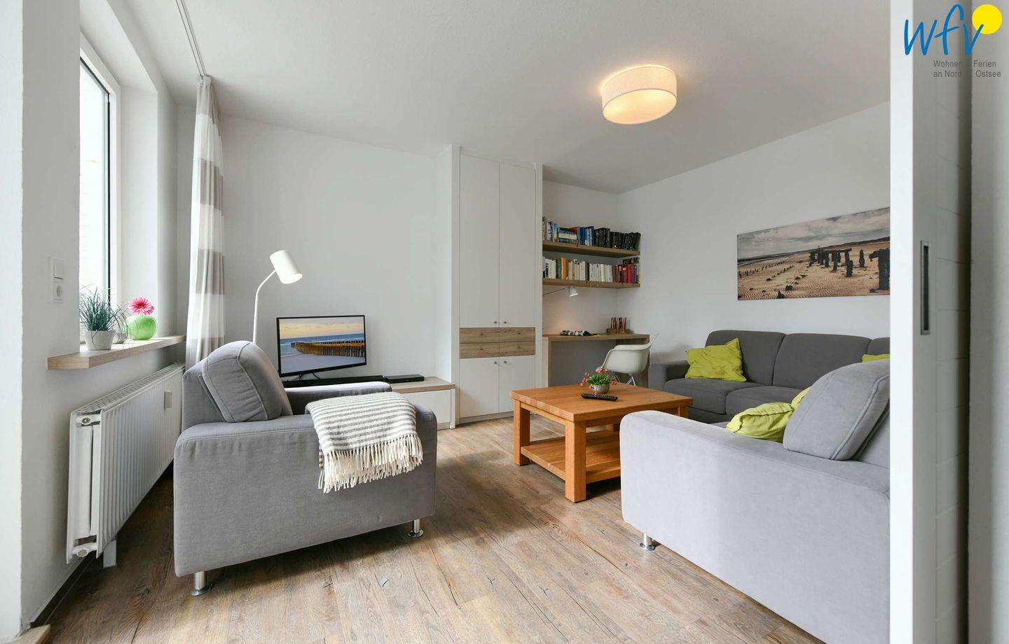 Eine bequeme Couchlandschaft und ein moderner Flat-TV machen den Wohnraum der Ferienwohnung zur gemütlichen Relaxzone für gemeinsame Stunden mit der Familie. Eine Auswahl an Spielen, DVDs und Büchern sowie freies WLAN steht Ihnen hier ebenfalls zur Verfügung.