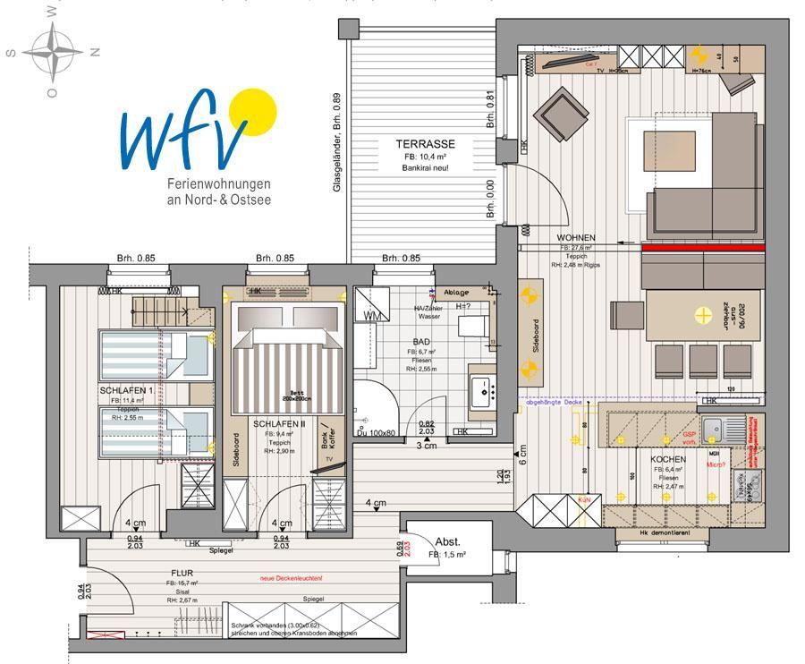 Helle, großzügig angelegte Räume, stilvolles Mobiliar und zusätzliche Details (wie zwei Flat-TVs, ein großer Esstisch und hochwertige Badarmaturen) garantieren Ihnen exklusiven Wohnkomfort. Die Wangerooger Ferienwohnung verfügt über einen aufteilbaren Wohn-/Essbereich mit Schlafsofa (Schiebetür zwischen Sofa und Esstisch), zwei separate Schlafzimmer, eine offene Küche, ein modernes Bad und einen sonnigen Balkon.