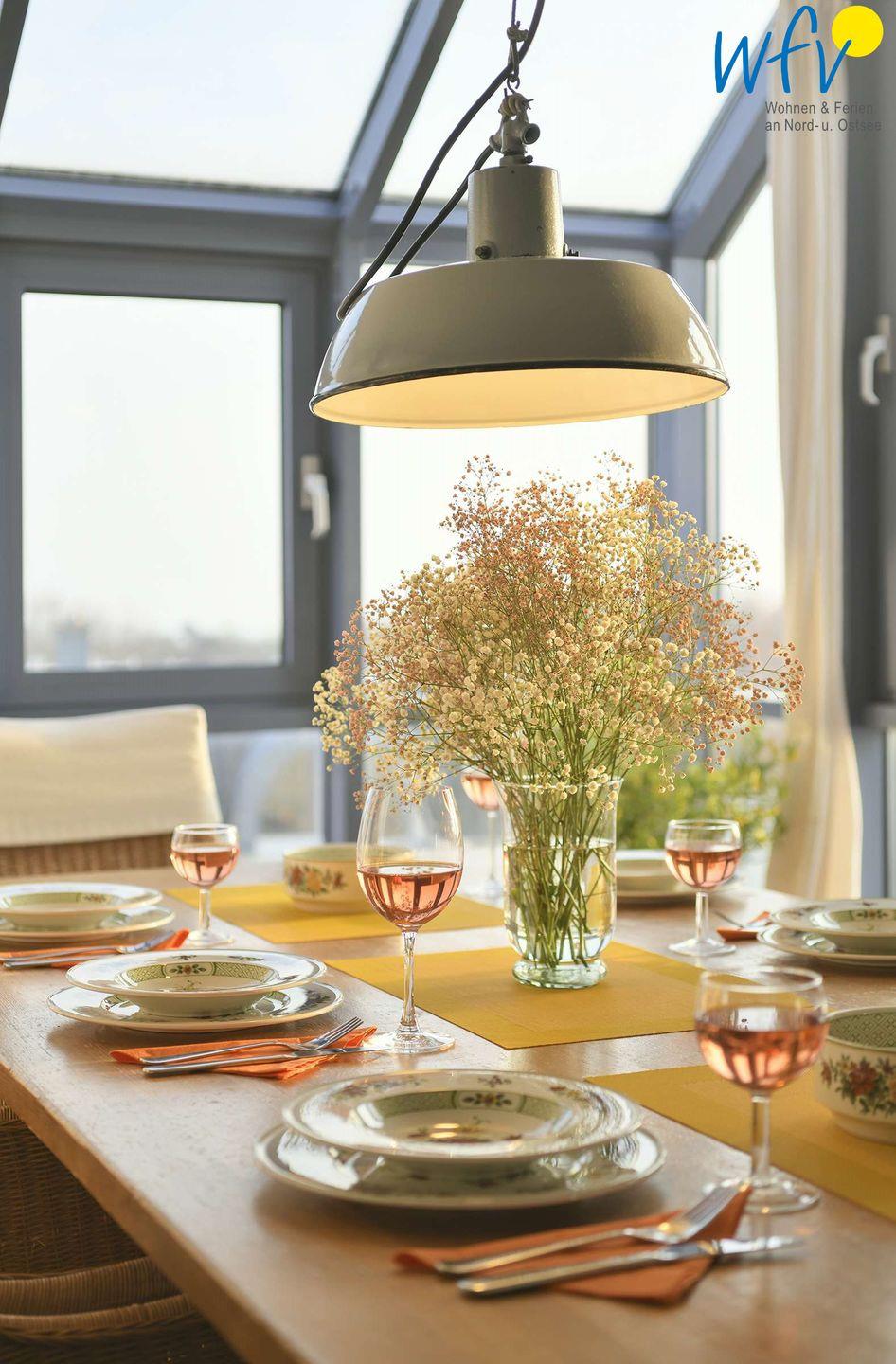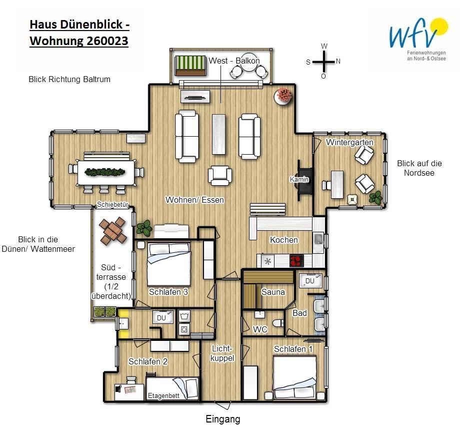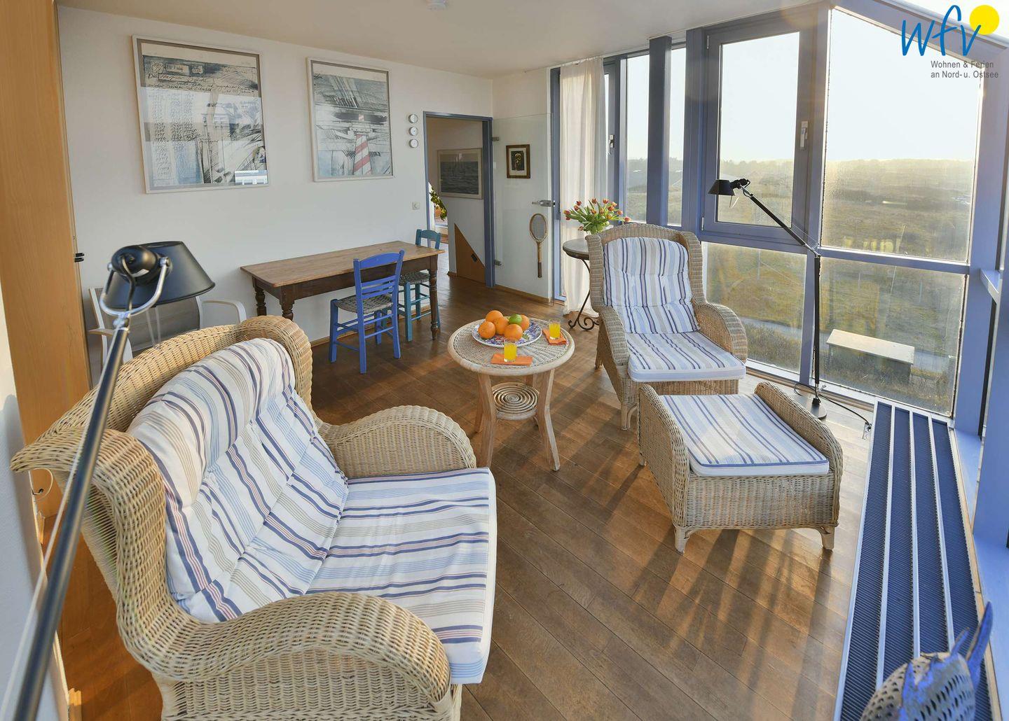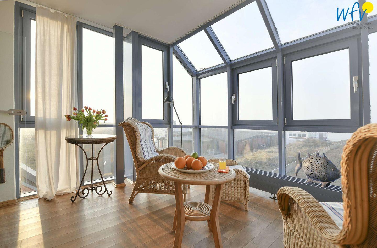 Eine geschützte "Frühstücks"-Südterrasse, ein großer West-Balkon mit weitem Blick über die Dünenlandschaft sowie ein Wintergarten mit Blick auf die Nordsee garantieren Ihnen wunderschöne Entspannungsmomente. Ebenso die wohnungseigene Sauna der Wangerooger Ferienwohnung!