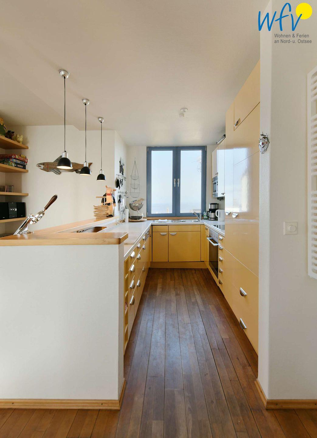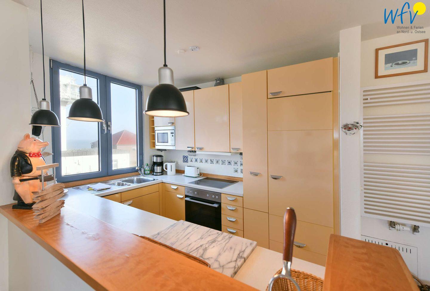 Die integrierte Küche ist u.a. mit Spülmaschine, Herd mit Ceranfeld und Backofen, großem Kühlschrank und Mikrowelle ausgestattet.