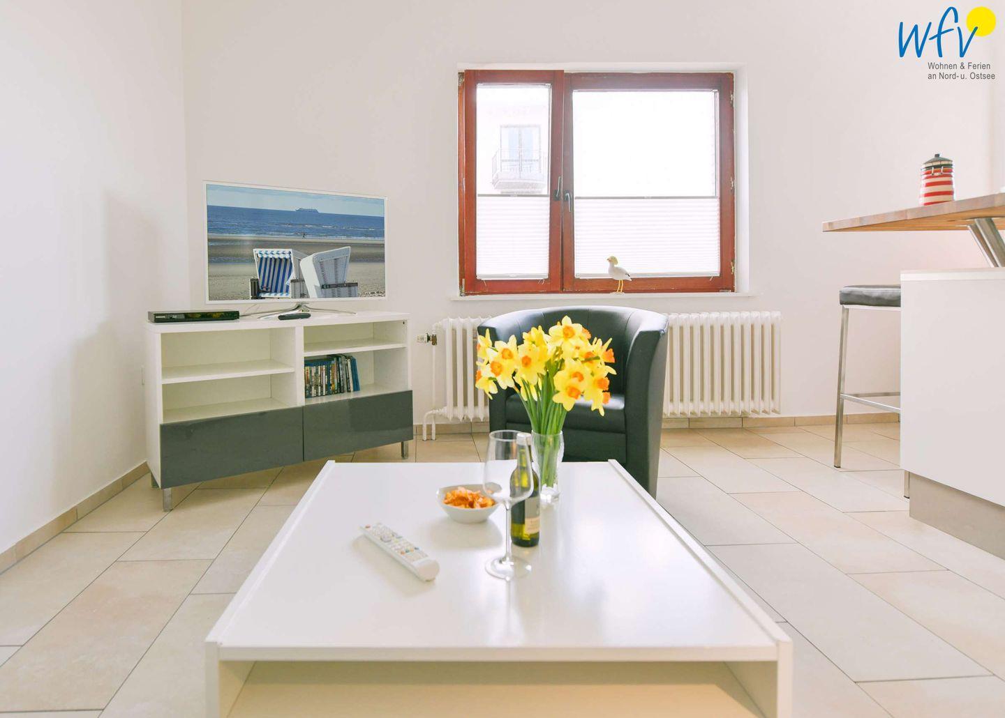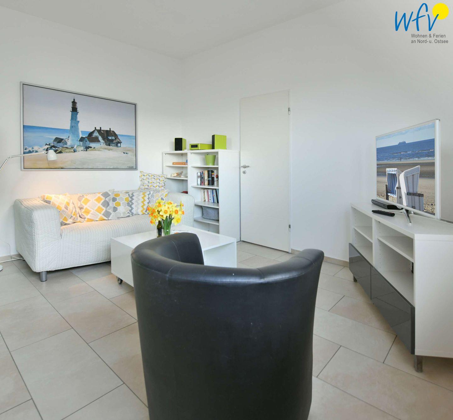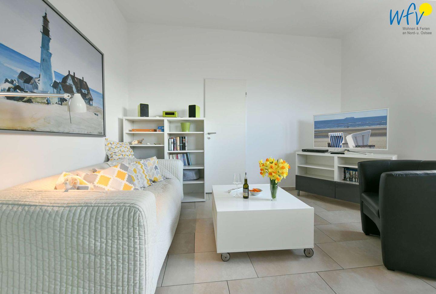 Machen Sie es sich in Ihrem Urlaub auf Wangerooge gemütlich! Der komfortable Wohnraum ist mit einer bequemen Sofa-Sitzecke ausgestattet. Zum Fernsehen, Musik hören oder Lesen gibt es einen 3D-LED-Fernseher, eine Stereoanlage und einen DVD-/Blu-ray-Player sowie eine Blu-ray-Sammlung und jede Menge Bücher.