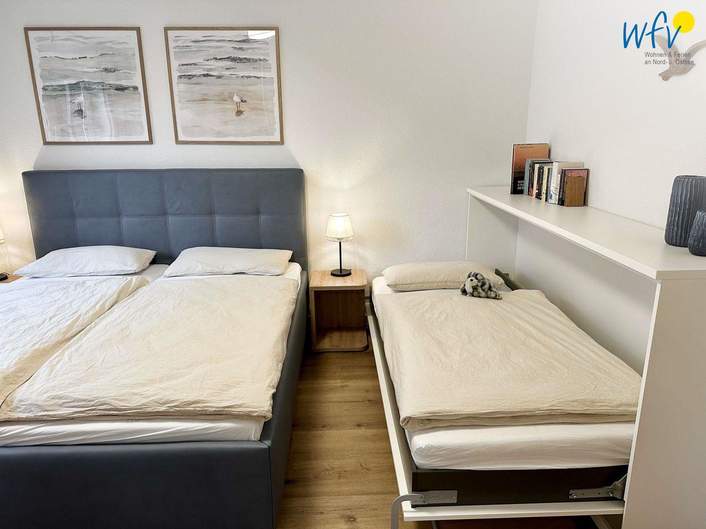 Wenn auf Wangerooge die Bordsteine hochgeklappt werden, wartet auf Sie ein gemütliches separates Schlafzimmer mit Doppelbett (180 x 200 cm). Hier befindet sich zusätzlich ein Einzelbett für eine weitere Person (80 x 200 cm).