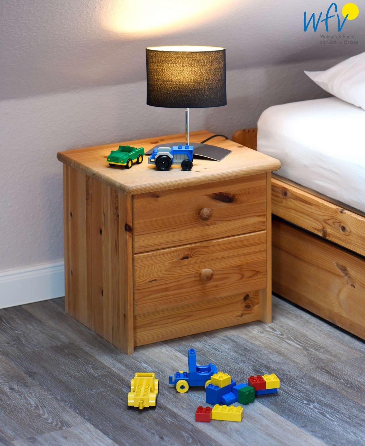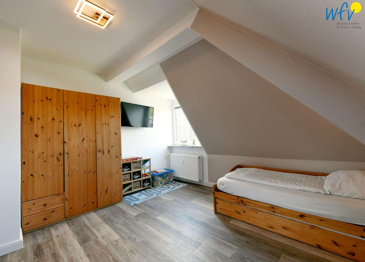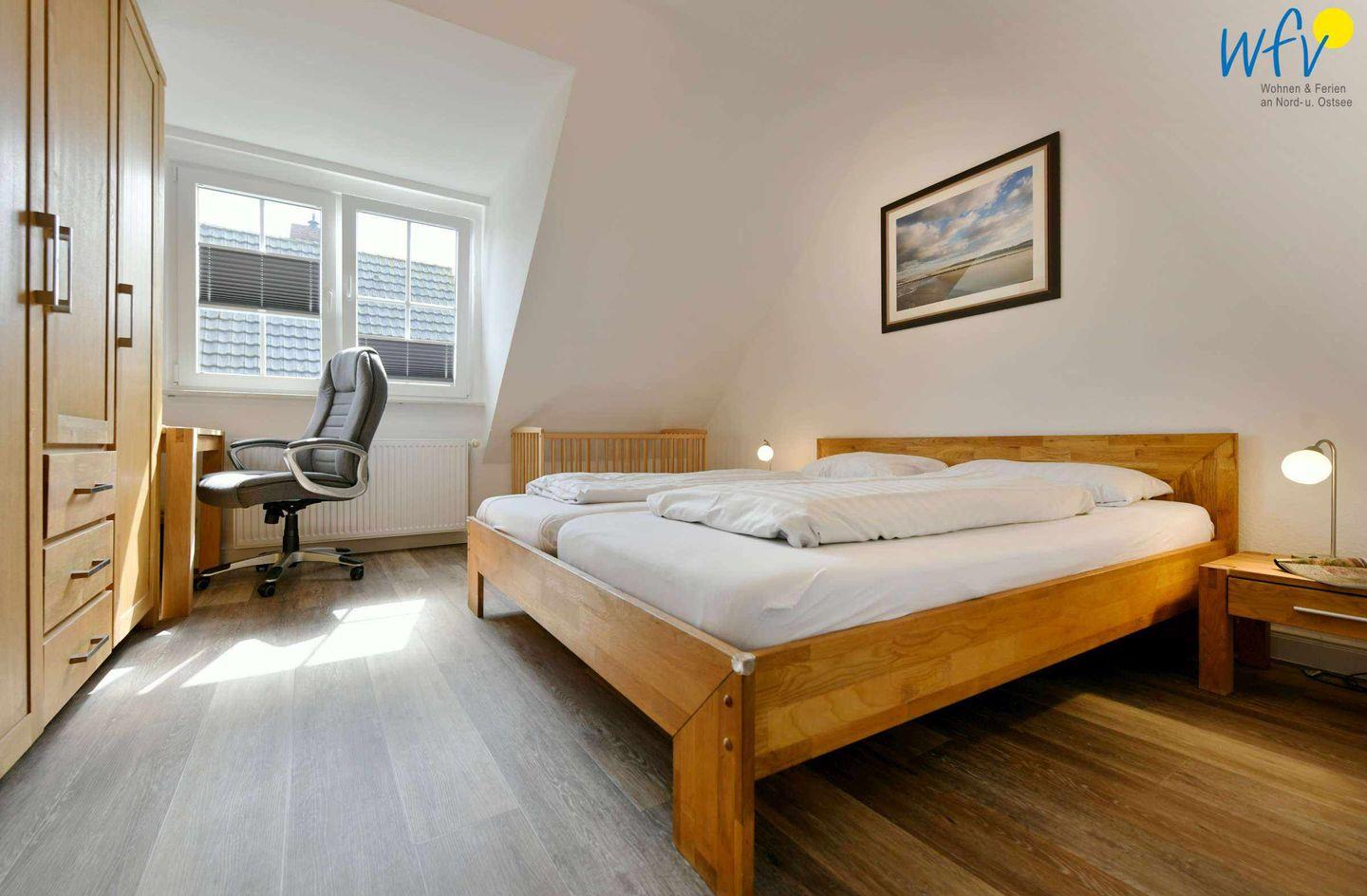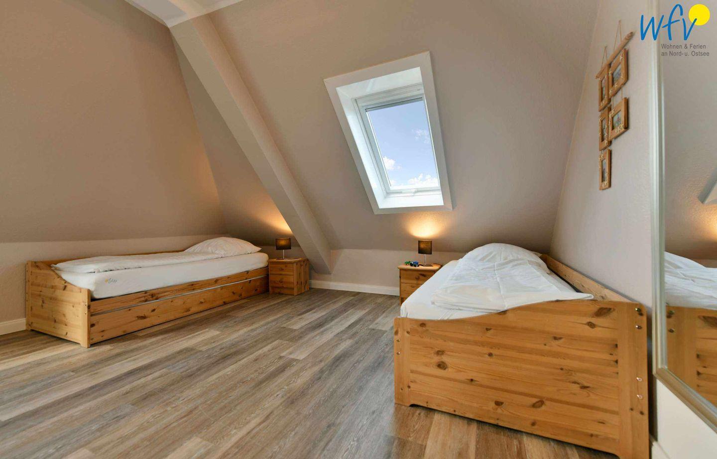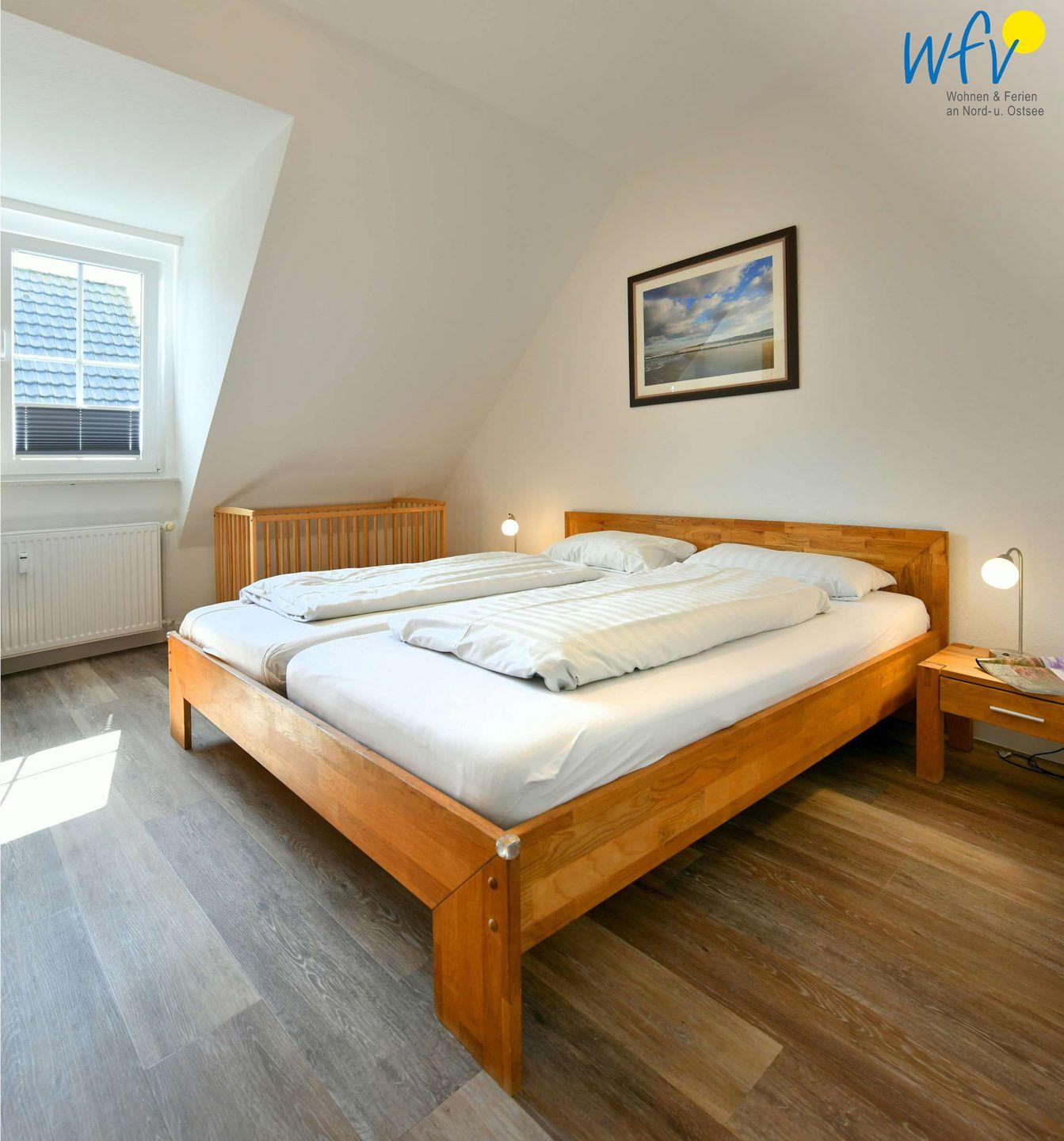Die zwei separaten Schlafzimmer der Ferienwohnung verfügen über eine optimale Bettenaufteilung. Ein Schlafzimmer ist mit einem Doppelbett (180 x 200 cm) und einem Kinderbett ausgestattet; das zweite Schlafzimmer mit zwei Einzelbetten (je 90 x 200 cm), von denen eines einen Tandemauszug besitzt, sodass hier insgesamt drei Erwachsene bequem schlafen können.