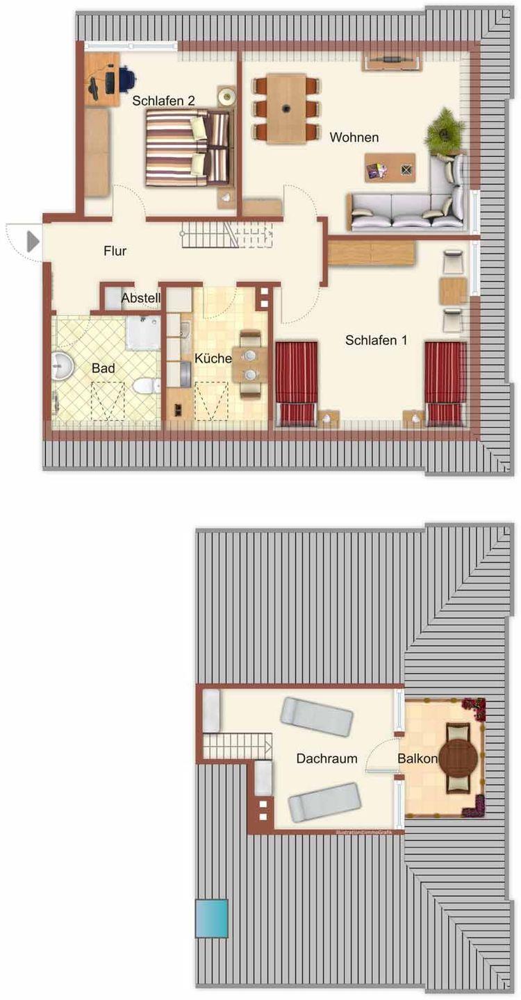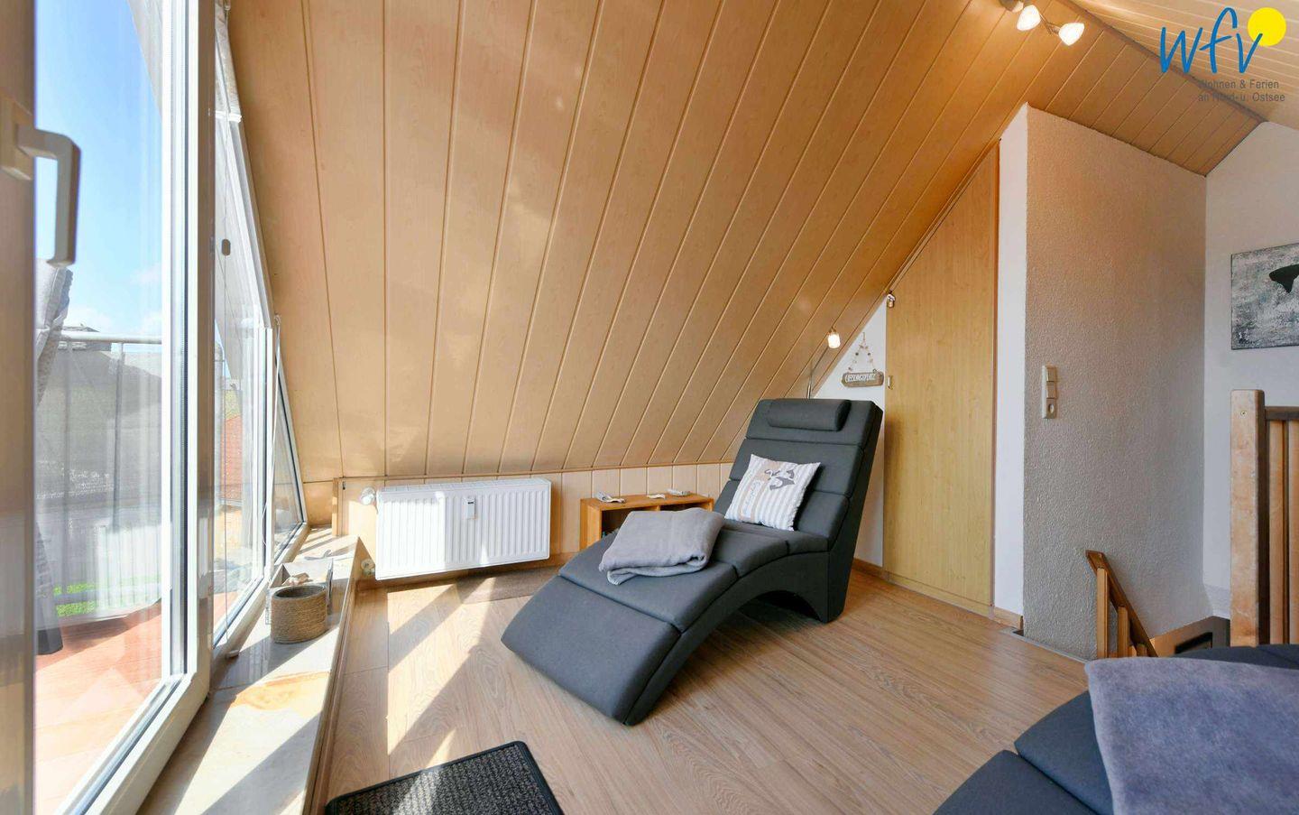 Die Unterkunft befindet sich im 1. Obergeschoss an der Südwestseite des "Hauses Dünenrose" und besitzt eine hübsche Dachgalerie (Lesestudio). Von hier aus gelangen Sie auf den Balkon zur Westseite, der Ihnen einen herrlichen Blick zum Wattenmeer und auf den alten Leuchtturm bietet.