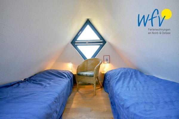 Im Obergeschoss des "Ferienhaus Friesenblick" befinden sich drei Schlafzimmer; im Dachgeschoss liegt das vierte Schlafzimmer. Zwei der Räume verfügen über ein Doppelbett, die beiden anderen Schlafzimmer sind jeweils mit zwei Einzelbetten eingerichtet.
