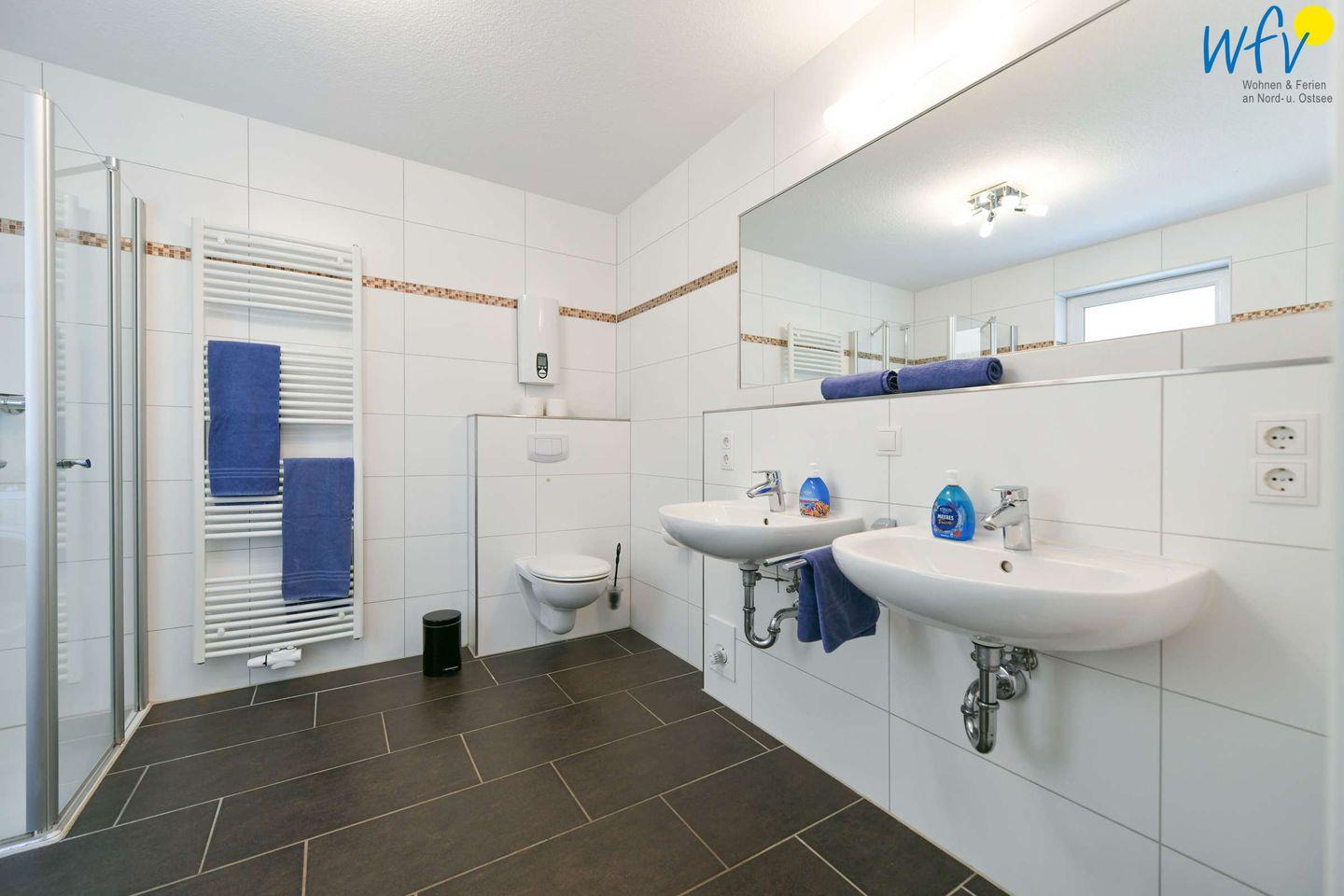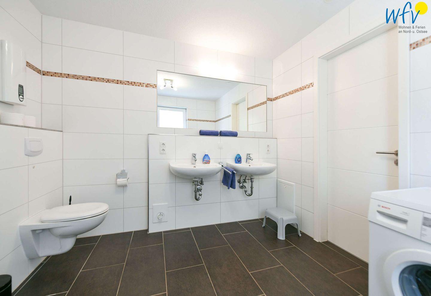 Im Bad finden Sie zwei Waschbecken und eine ebenerdige Dusche vor; zusätzlich stehen Ihnen hier Waschmaschine und Trockner zur Verfügung.
