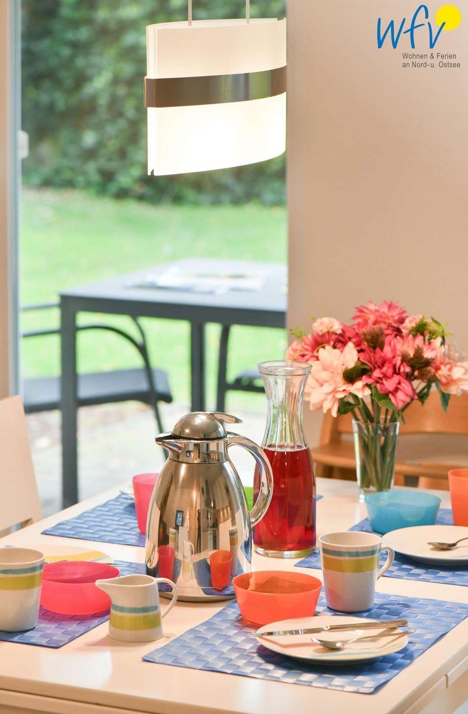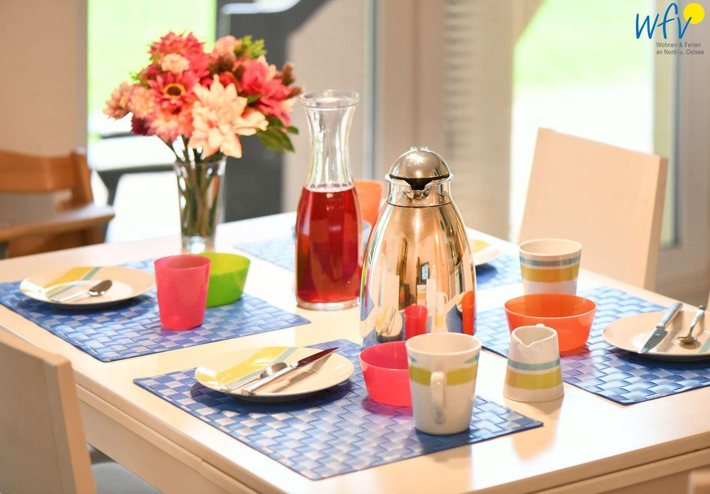 Die Küche ist komplett ausgestattet; neben dem normalen Essgeschirr gibt es Kinderbesteck und Geschirr für zwei Kinder. Für junge Familien ist ein Sterilisator für Kinderflaschen und ein Babykosterwärmer vorhanden.