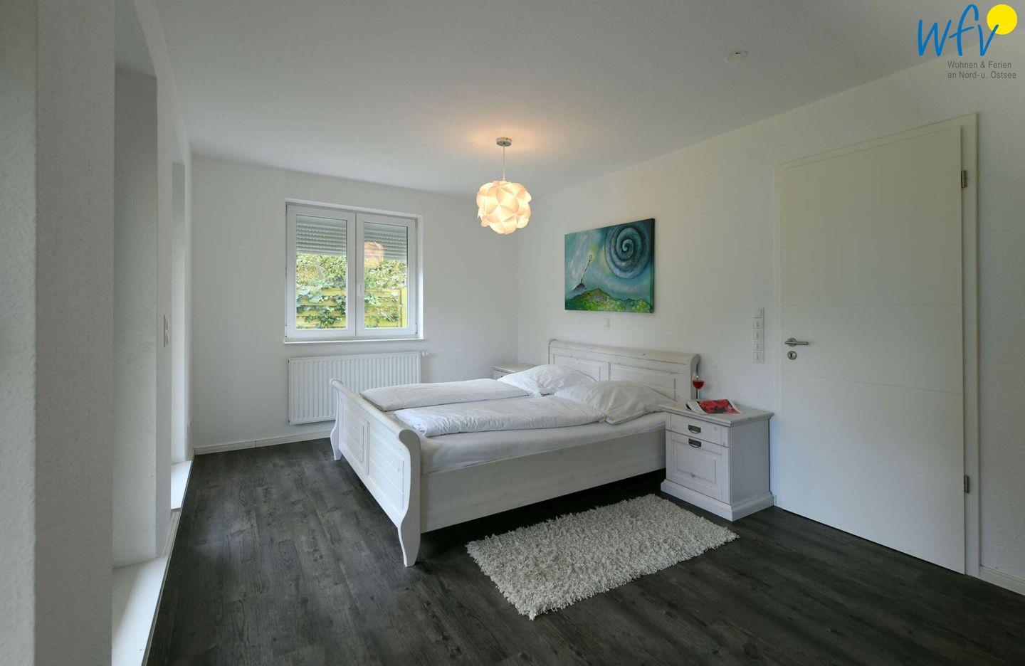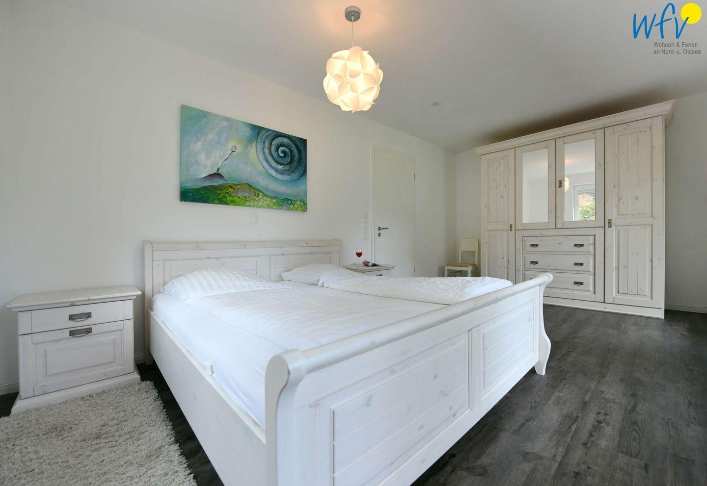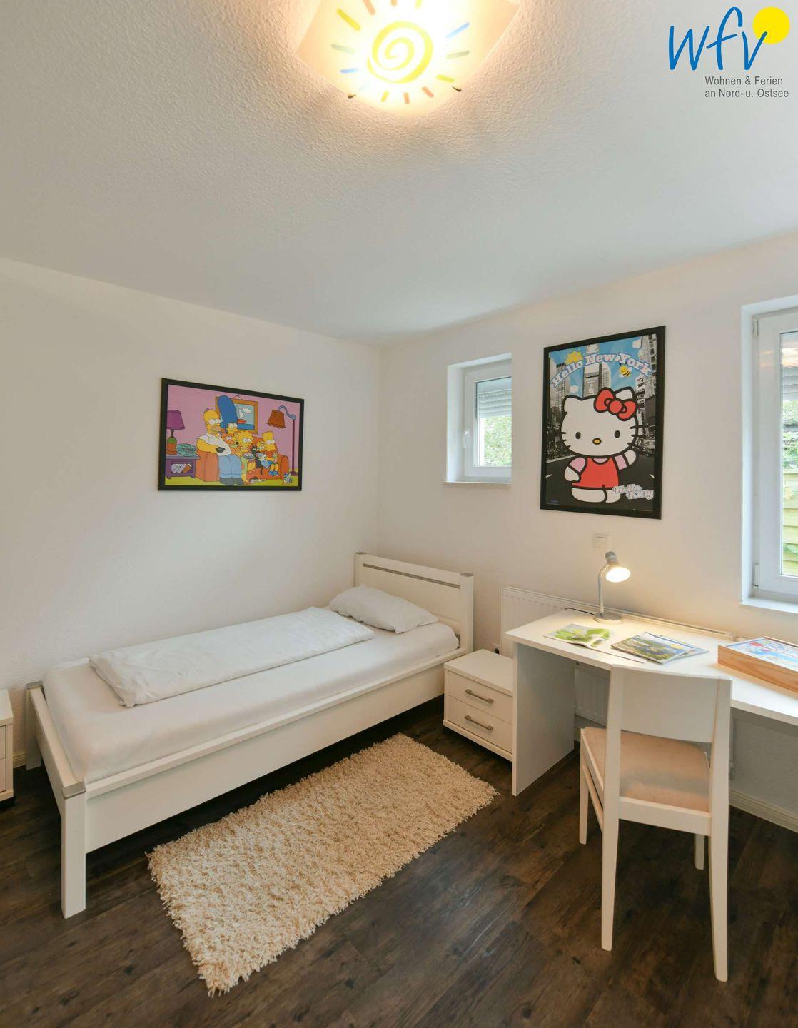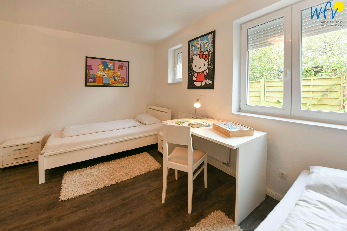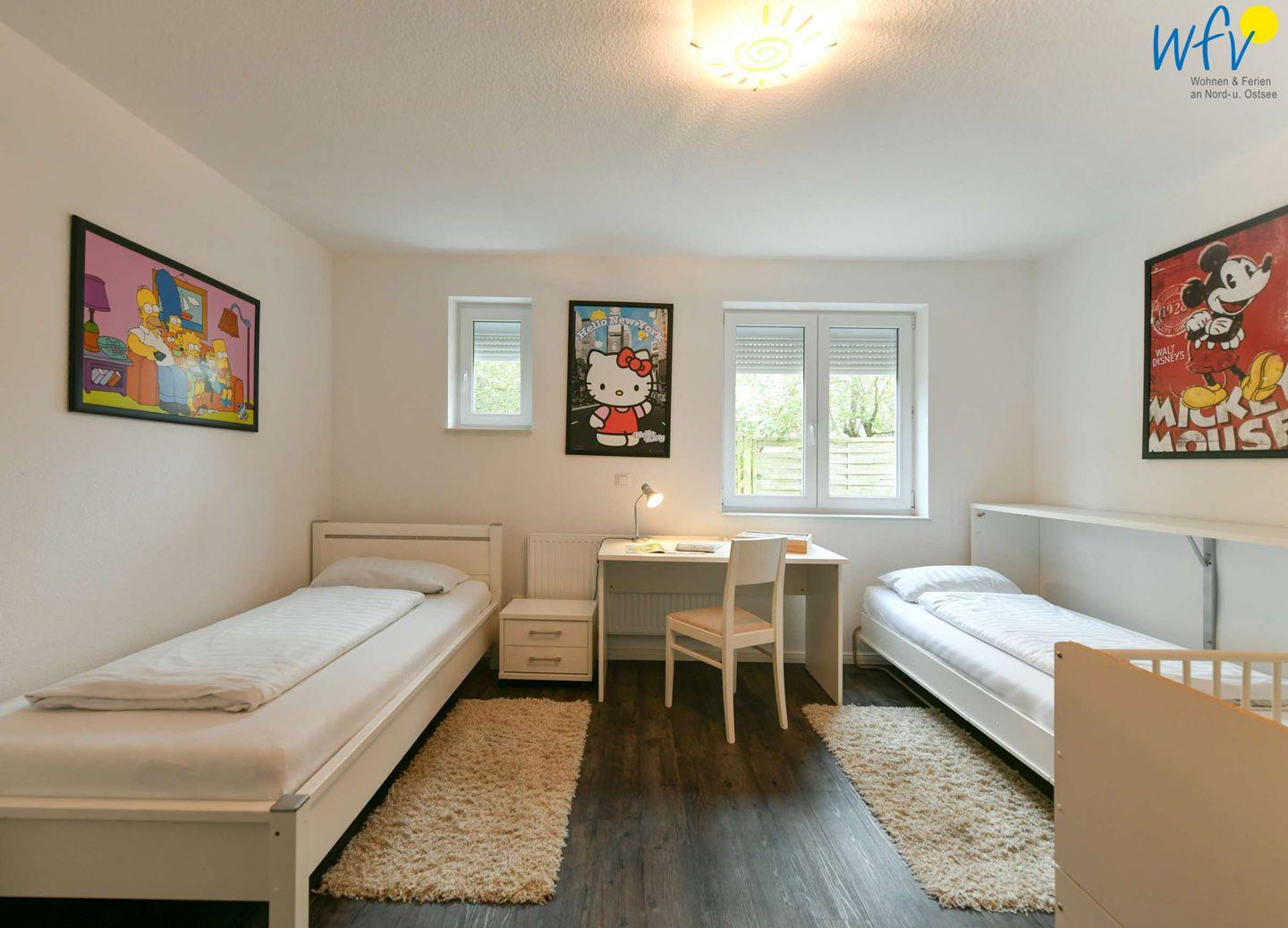 In dem separaten Elternschlafzimmer der Ferienwohnung auf Wangerooge befinden sich ein Doppelbett und ein großer Kleiderschrank. Das Kinderzimmer ist mit einem Kleiderschrank, zwei Einzelbetten sowie einem Kinderbett mit Matratze und Bettwäsche ausgestattet. Das Kinderbett steht Ihnen ohne Aufpreis zur Verfügung. Es ist auch als Laufstall nutzbar; die Einzelbetten können außerdem bei Bedarf mit einem Bettschutzgitter ausgerüstet werden. Sowohl das Elternschlafzimmer, als auch das Kinderzimmer verfügen über Jalousien.